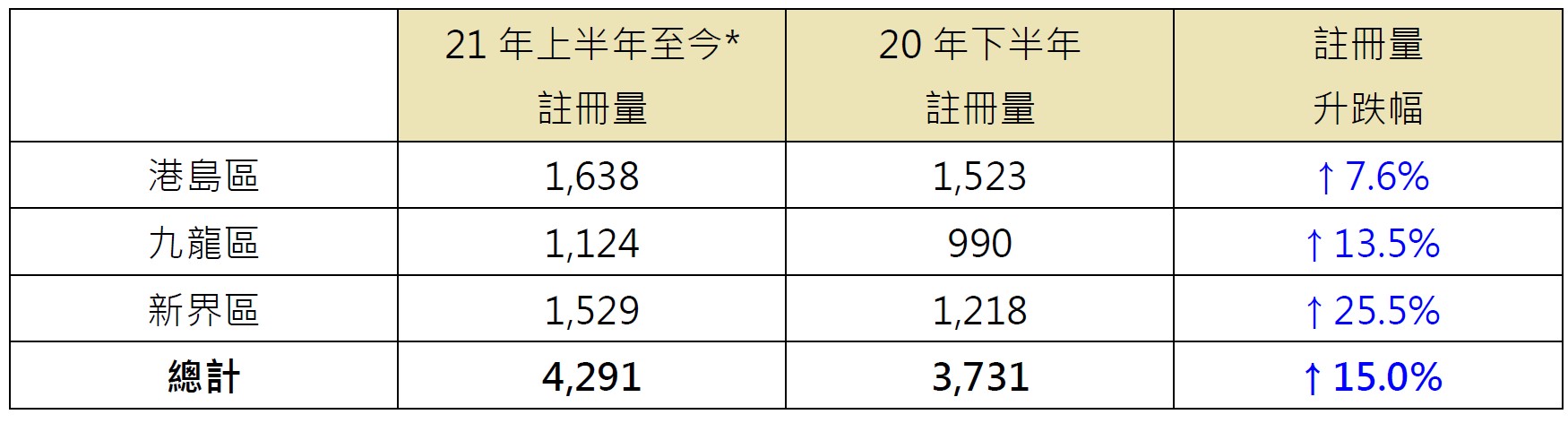 若以港岛、九龙及新界三区划分上半年至今逾1,000万元二手住宅注册量表现,其中新界区录1,529宗注册,较去年下半年的1,218宗高出约25.5%;九龙区录1,124宗注册,较去年下半年的990宗高出约13.5%;港岛区录1,638宗注册,较去年下半年的1,523宗高出约7.6%(见表)。