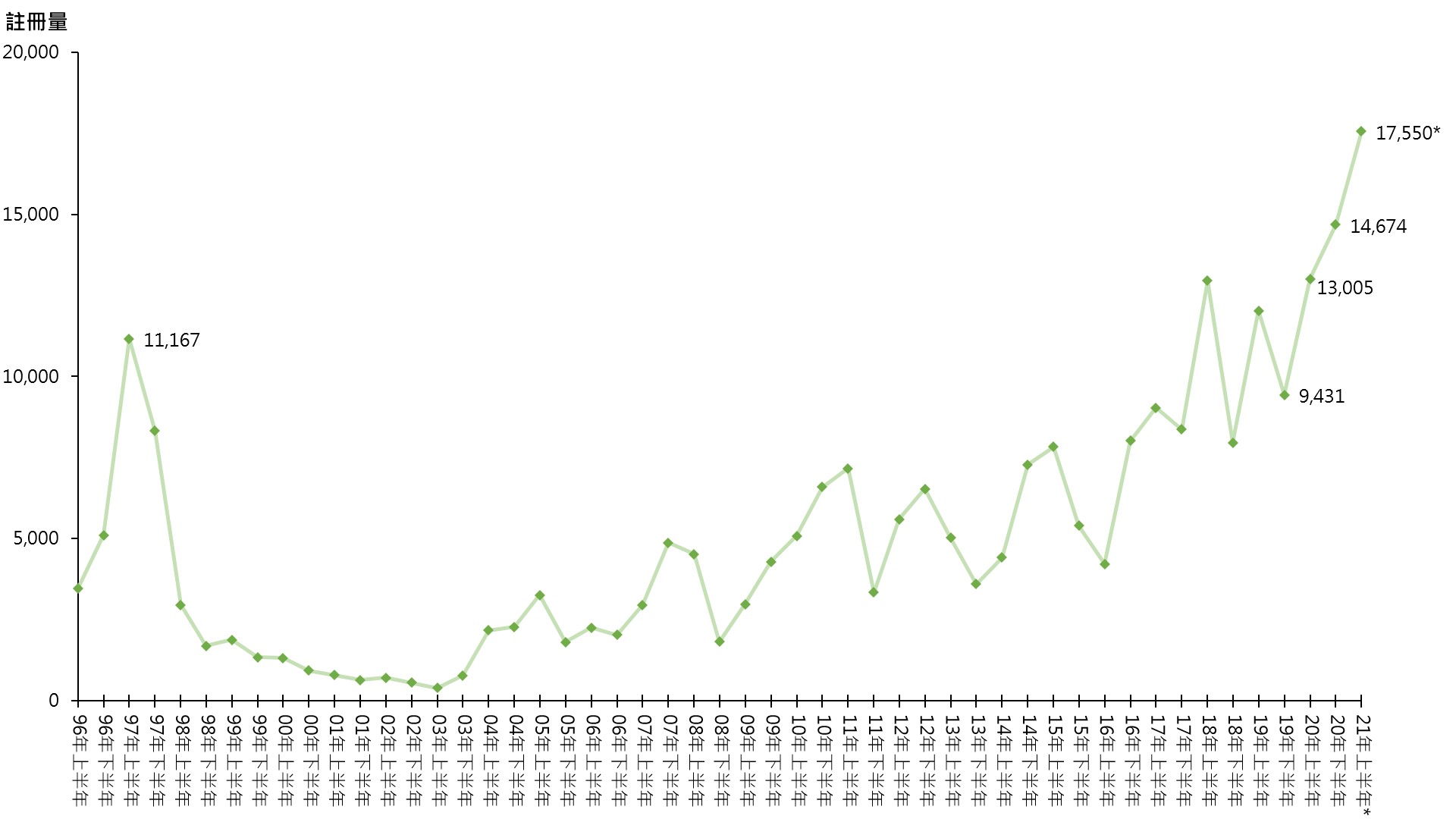 自政府于19年10月推出放宽按揭保险措施,受惠的中细价二手住宅物业交投畅旺。据土地注册处最新资料显示,本年至今(截至6月9日)录17,550宗逾500万至1,000万元二手住宅注册,已较去年下半年的14,674宗高出约19.6%,兼续创有纪录新高(见图)。