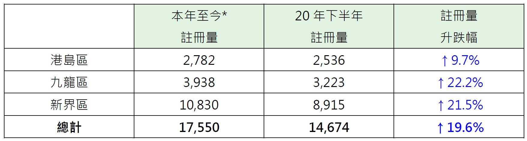 表:本年至今*三区逾500万至1,000万元二手住宅注册量与20年下半年比较