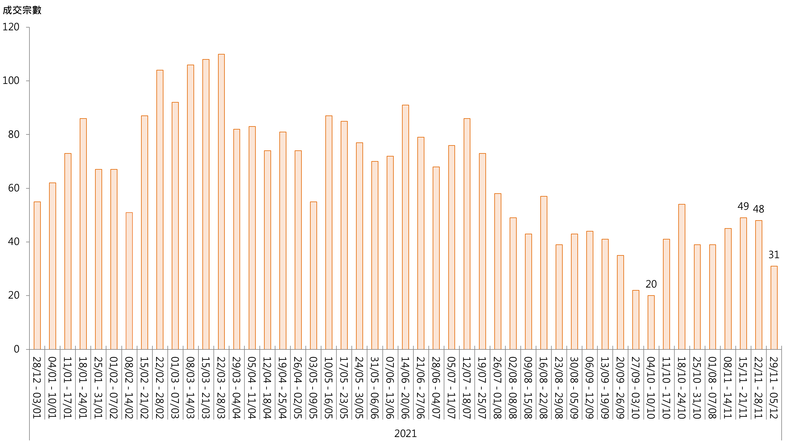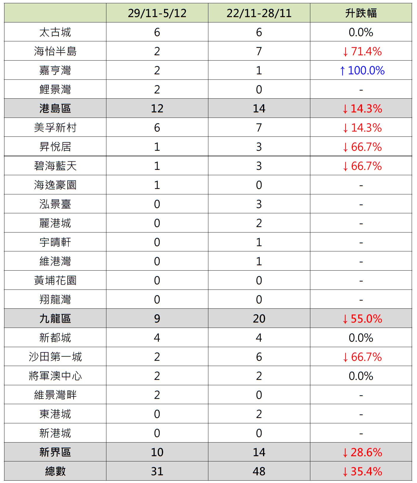 据本行前线分行所录得的数字显示,综合过去一星期(11月29日至12月5日)全港20大主要屋苑二手买卖录31宗成交,较前周(11月22日至11月28日)的48宗(见图)减少约35.4%。