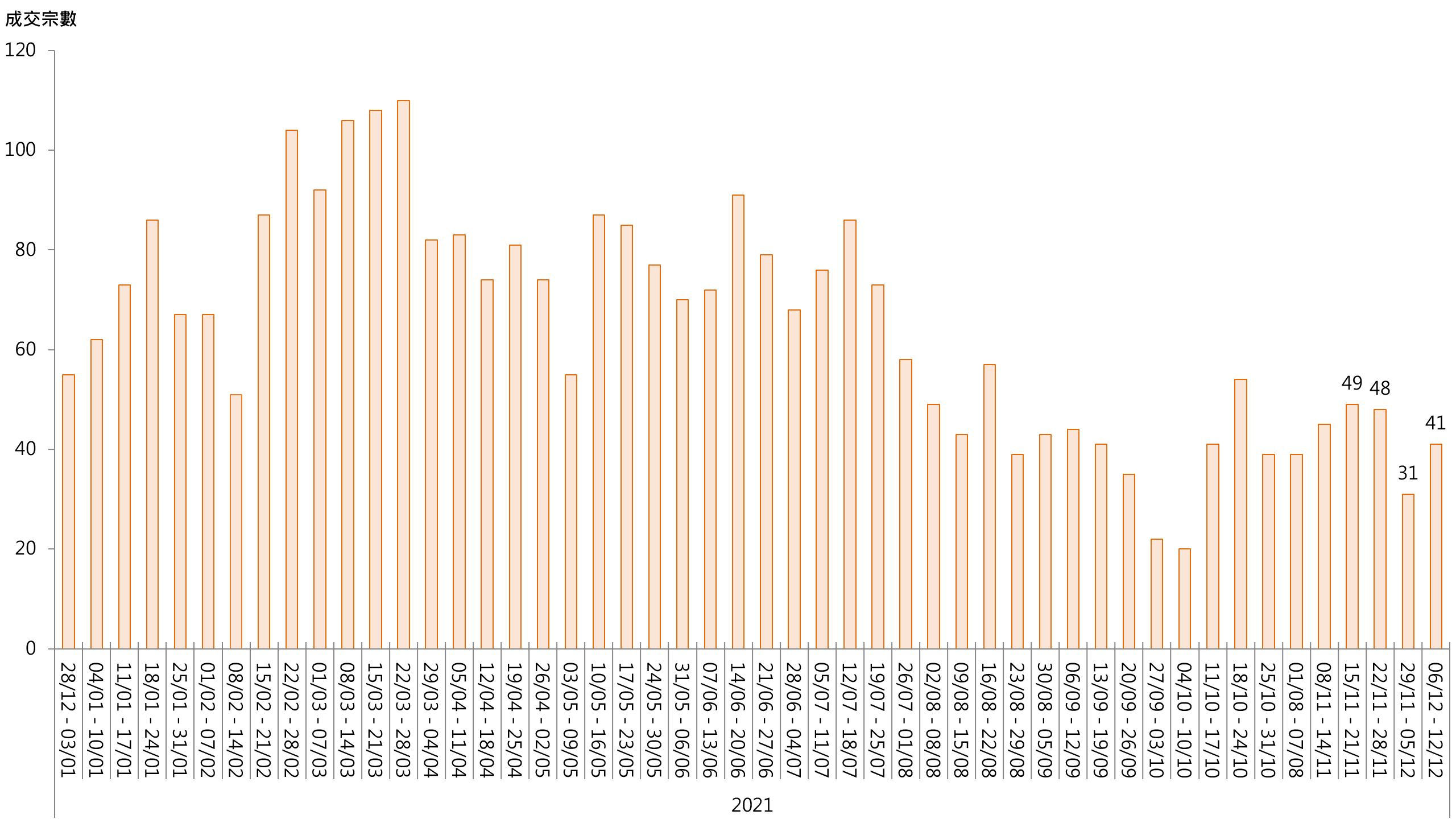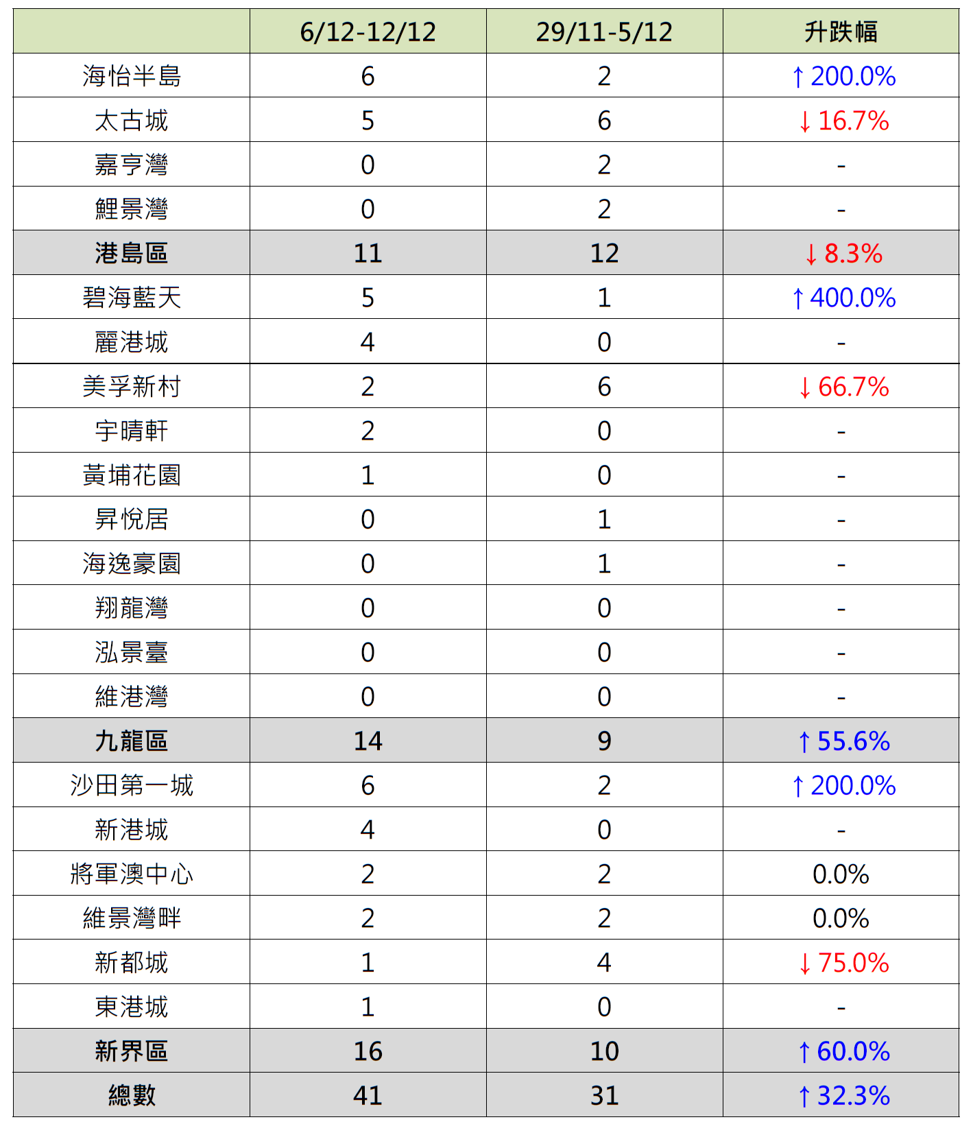 据本行前线分行所录得的数字显示,综合过去一星期(12月6日至12月12日)全港20大主要屋苑二手买卖录41宗成交,较前周(11月29日至12月5日)的31宗(见图)增加约32.3%。