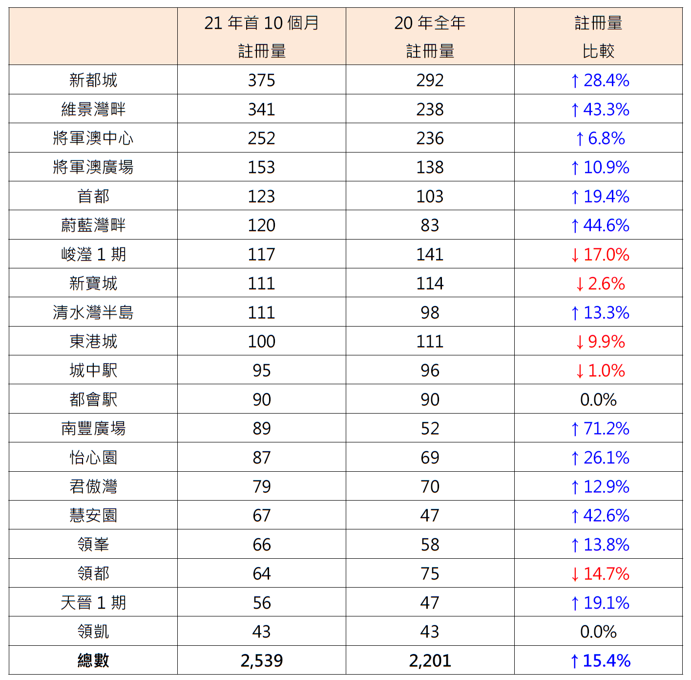 表:今年首10个月将军澳区20个私人屋苑二手注册量与20年全年比较