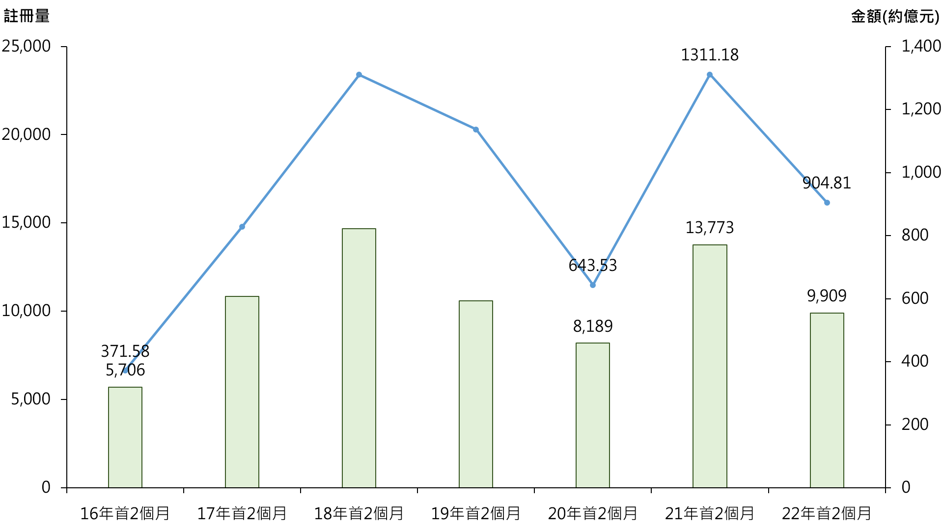 据土地注册处资料显示,今年首2个月整体物业(包括一、二手住宅、一手公营房屋、工商舖及车位)录9,909宗注册,较去年同期的13,773宗减少约28.1%;涉及注册金额录约904.81亿元,较去年同期约1,311.18亿元减少约31%。整体物业注册量额按年同期跌幅显著,主要由于去年同期楼市相对畅旺。事实上,若与20年首2个月相比,今年首2个月整体物业注册量仍高约21%,而注册金额更高约4成(见图)。