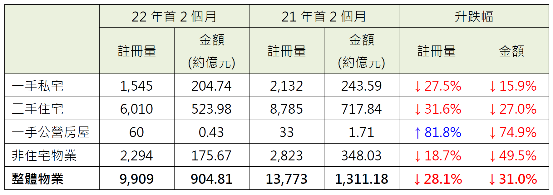 表:今年首2个月各类物业注册量额与去年同期比较
