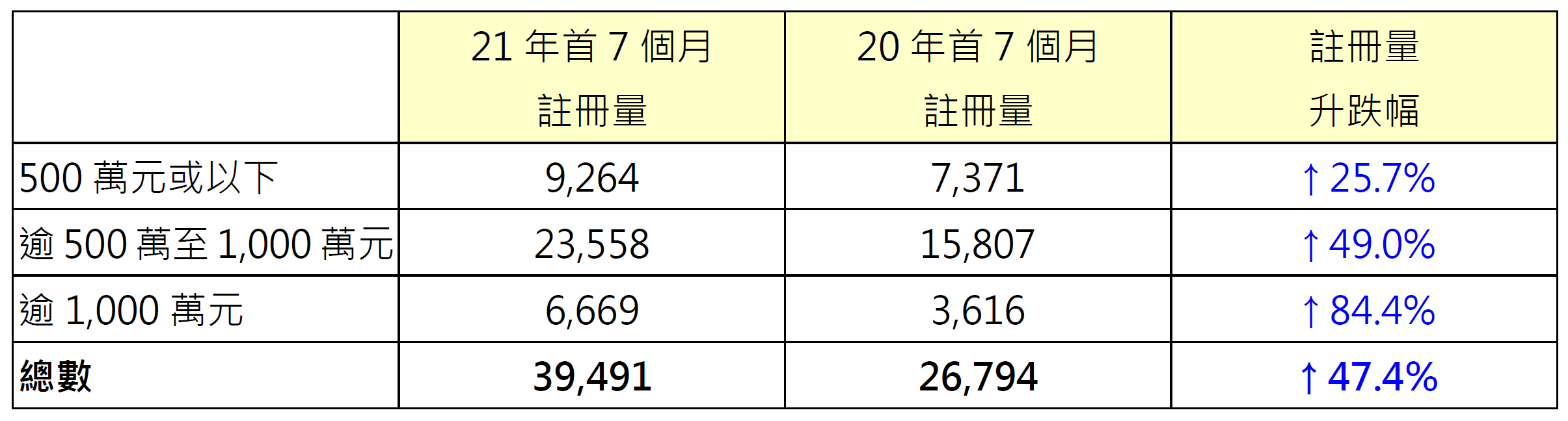 若按金额划分今年首7个月二手住宅注册量表现,当中价值1,000万元以上二手住宅物业录6,669宗注册,较去年同期的3,616宗增加约84.4%;价值500万以上至1,000万元二手住宅物业录23,558宗注册,较去年同期的15,807宗增加约49%;价值500万元或以下二手住宅物业录9,264宗注册,较去年同期的7,371宗增加约25.7%(见表)。
