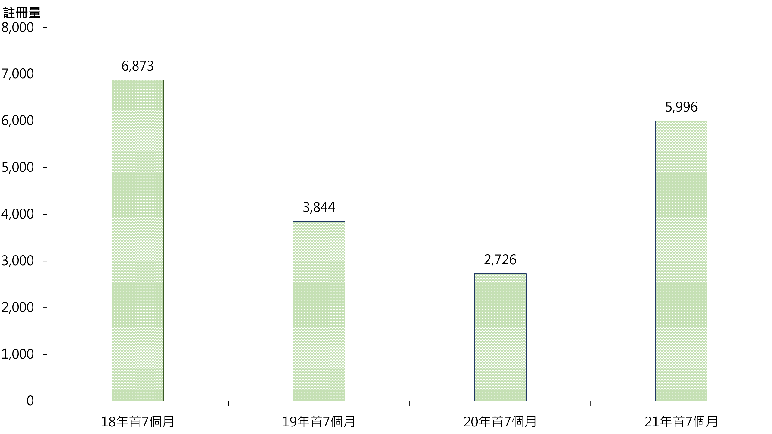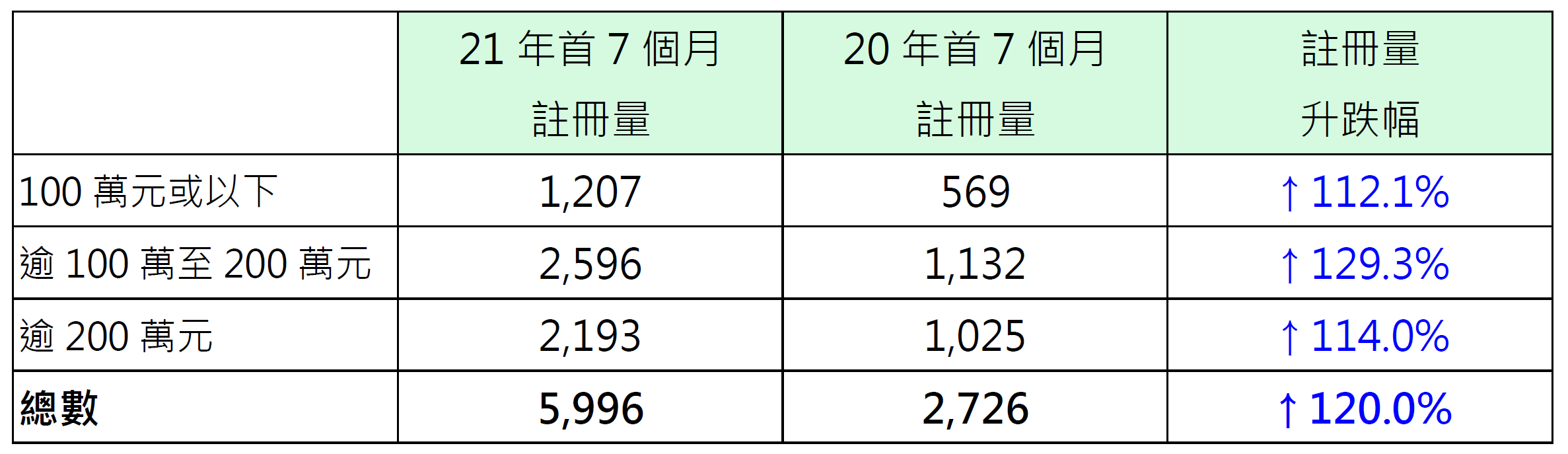 若以港岛、九龙及新界三区划分今年首7个月纯车位注册量表现,其中港岛区录970宗注册,较去年同期的438宗增加约121.5%;九龙区录1,255宗注册,较去年同期的559宗增加约124.5%;新界区录3,771宗注册,较去年同期的1,729宗增加约118.1%。