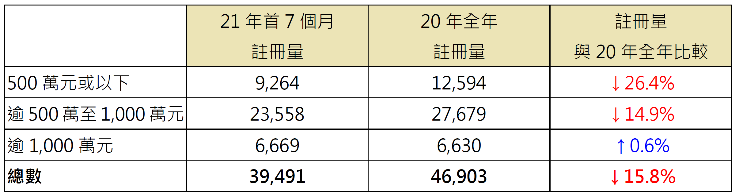 观乎整体二手住宅注册量表现,今年首7个月录39,491宗注册,尚与去年全年的46,903宗有约15.8%的差距;当中逾500万至1,000万元二手住宅录23,558宗注册,尚与去年全年的27,679宗有约14.9%的差距;500万元或以下二手住宅录9,264宗注册,尚与去年全年的12,594宗有约26.4%的差距,可见逾1,000万元二手住宅注册量表现相对突出(见表)。