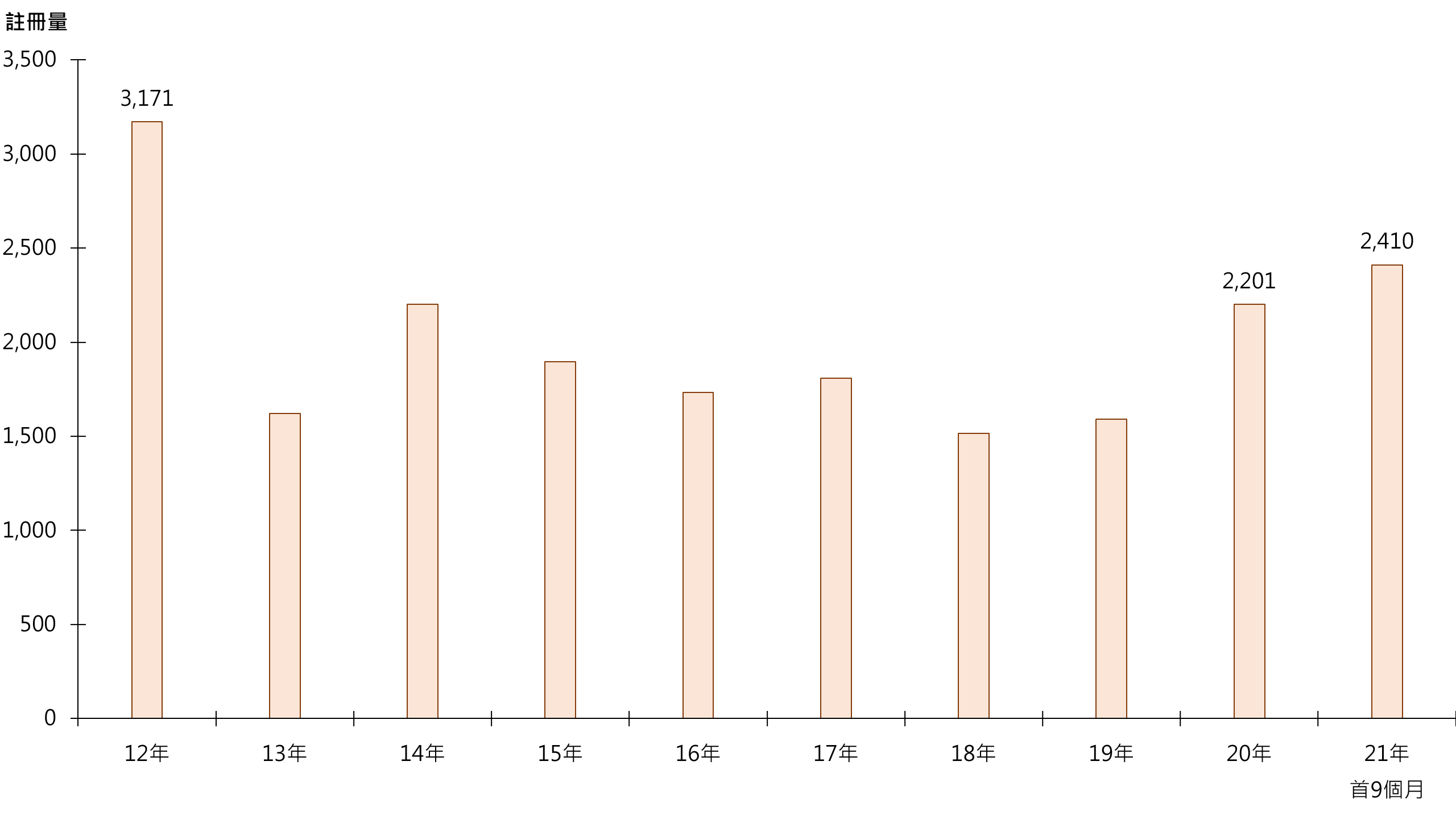据土地注册处资料显示,9月将军澳区20个私人屋苑录184宗二手住宅注册,较8月的249宗减少约26.1%。鉴于签署买卖合约至递交到土地注册处注册登记需时,9月注册个案一般主要反映8月市况。虽然注册量按月录跌,但按年表现则突出;今年首9个月录2,410宗注册,已高出去年全年2,201宗约9.5%,暂创近9年新高(见图)。