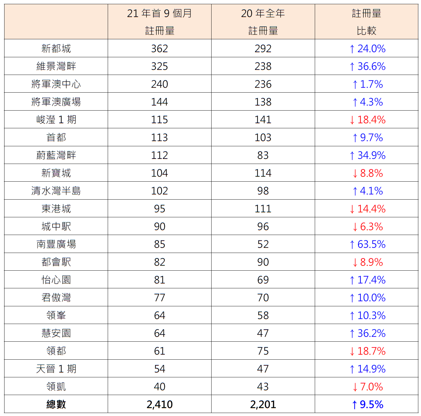 表:21年首9个月将军澳区20个私人屋苑二手注册量与20年全年比较