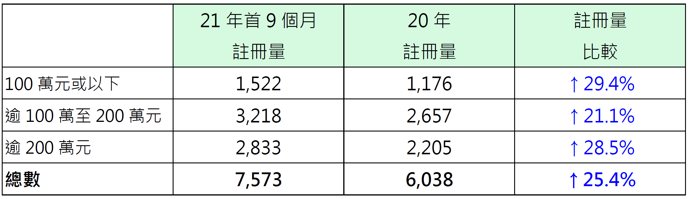 若按金额划分今年首9个月纯车位注册量表现,其中价值100万元或以下纯车位录1,522宗注册,较去年全年的1,176宗高出约29.4%;价值200万元以上纯车位录2,833宗注册,较去年全年的2,205宗高出约28.5%;价值100万以上至200万元纯车位录3,218宗注册,较去年全年的2,657宗高出约21.1%(见表)。