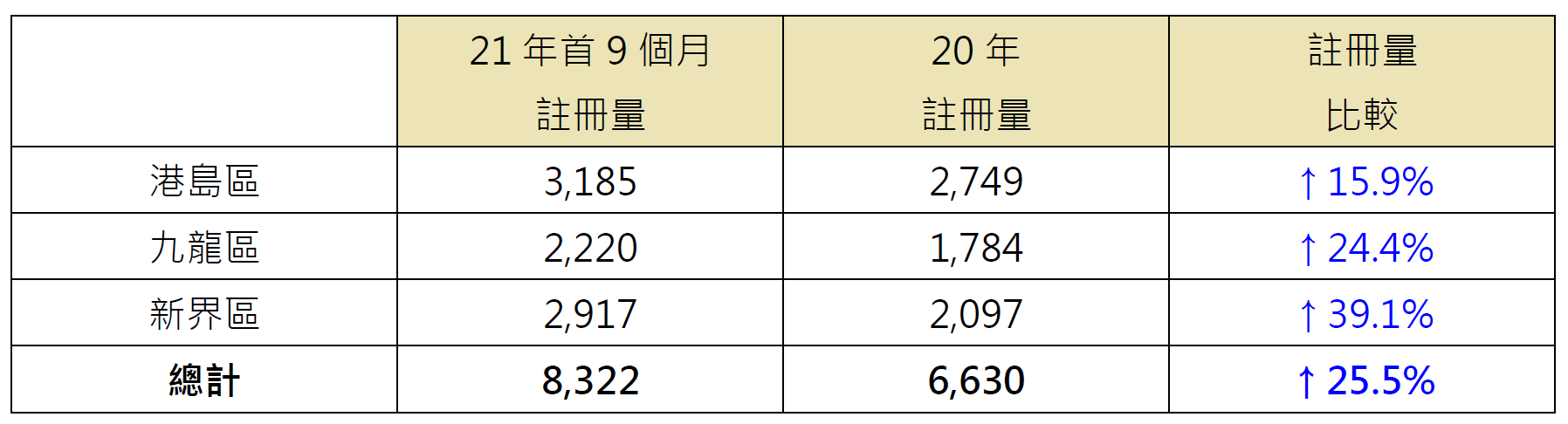 若以三区划分今年首9个月逾1,000万元二手住宅注册量表现,当中港岛区录3,185宗注册,较去年全年的2,749宗高出约15.9%;九龙区录2,220宗注册,较去年全年的1,784宗高出约24.4%;新界区录2,917宗注册,较去年全年的2,097宗高出约39.1%(见表)。