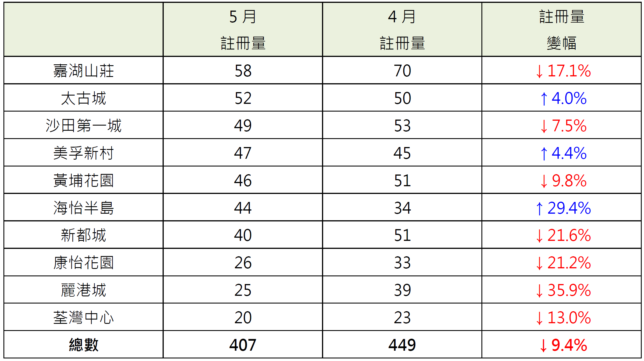至于二手住宅注册量屋苑排名方面,嘉湖山庄以58宗注册居榜首,较4月的70宗减少约17.1%;而排第二的屋苑为上述的太古城;沙田第一城则以49宗注册排第三,较4月的53宗减少约7.5%(见表)。