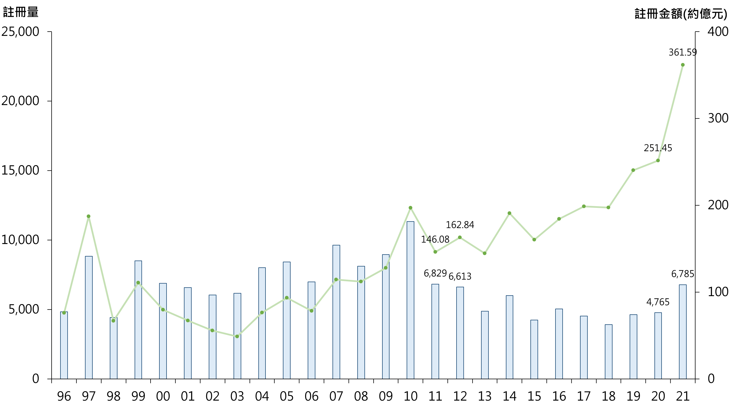 若以全年计,21年录6,785宗二手居屋注册,较20年的4,765宗增加约42.4%,创近10年新高;涉及注册金额录约361.59亿元,较20年约251.45亿元增加约43.8%,更首次超越300亿元水平,创有纪录新高(见图二)。