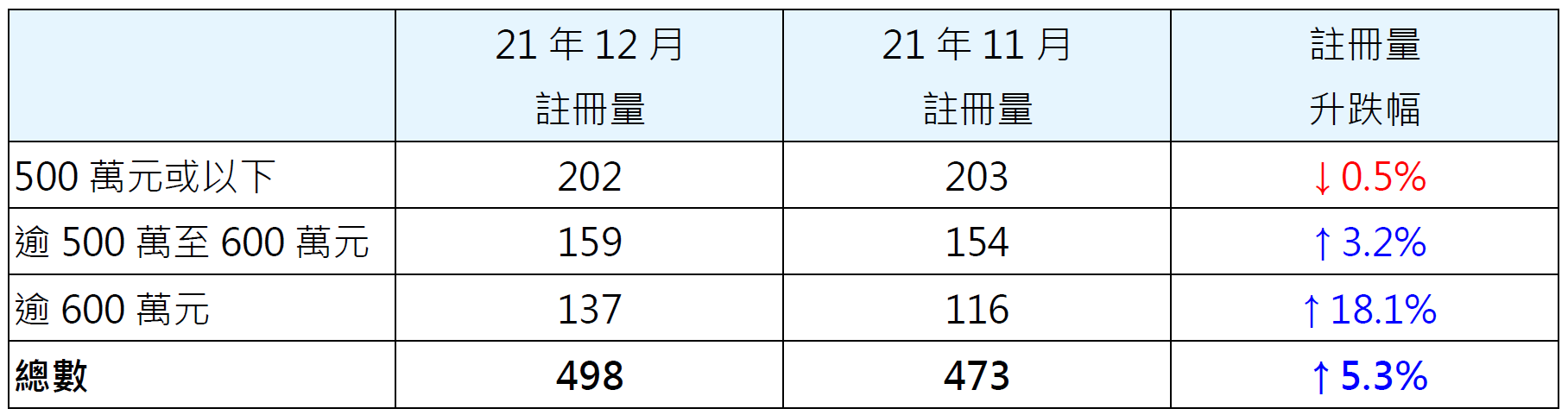 表一︰按金额划分21年12月二手居屋注册量与21年11月比较