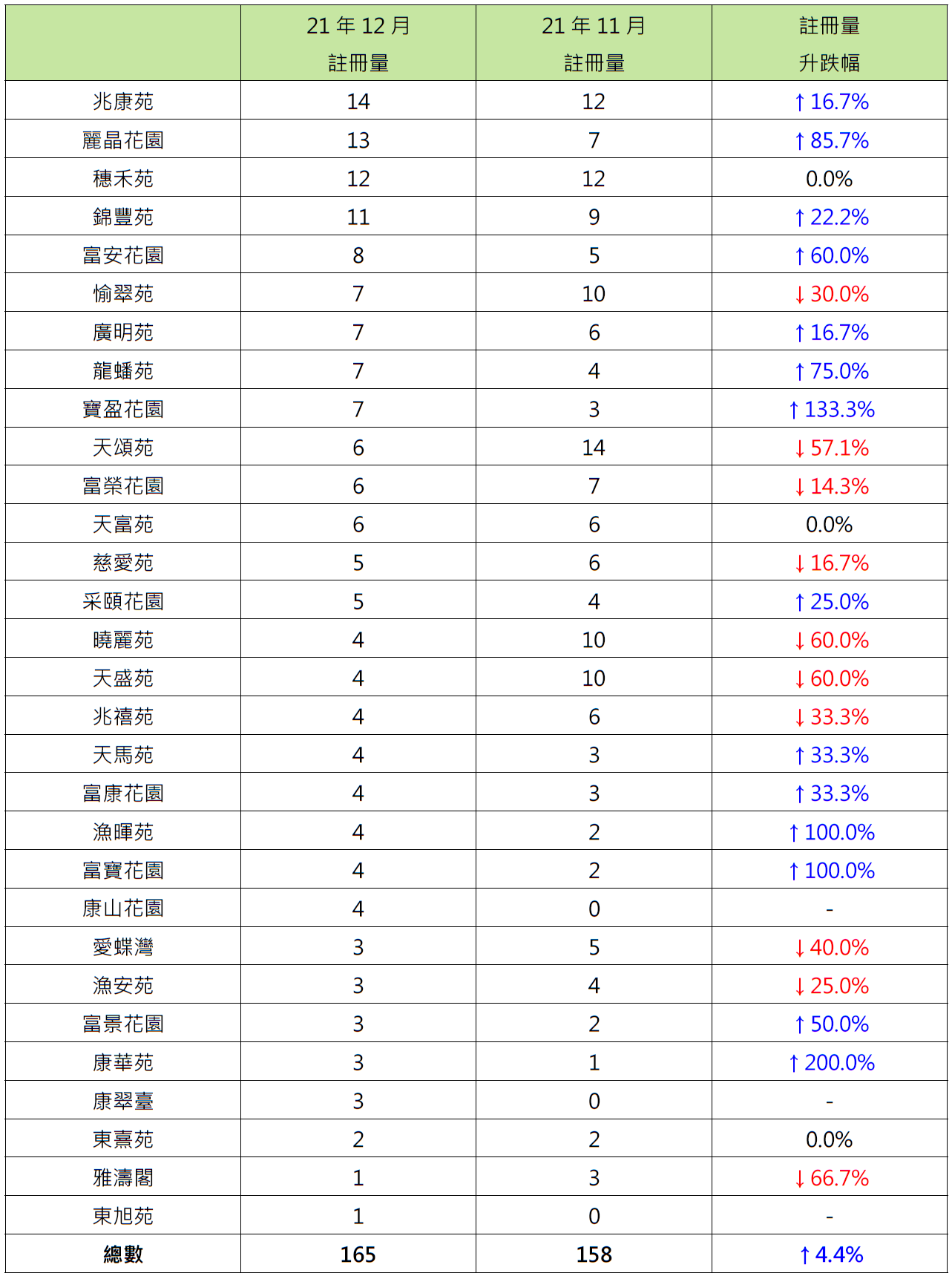 而去年12月二手居屋注册量屋苑排名方面,屯门兆康苑以14宗注册居榜首,较11月的12宗增加约16.7%;九龙湾丽晶花园以13宗注册排第二,较11月的7宗增加约85.7%;火炭穗禾苑以12宗注册排第三,按月持平(见表二)。