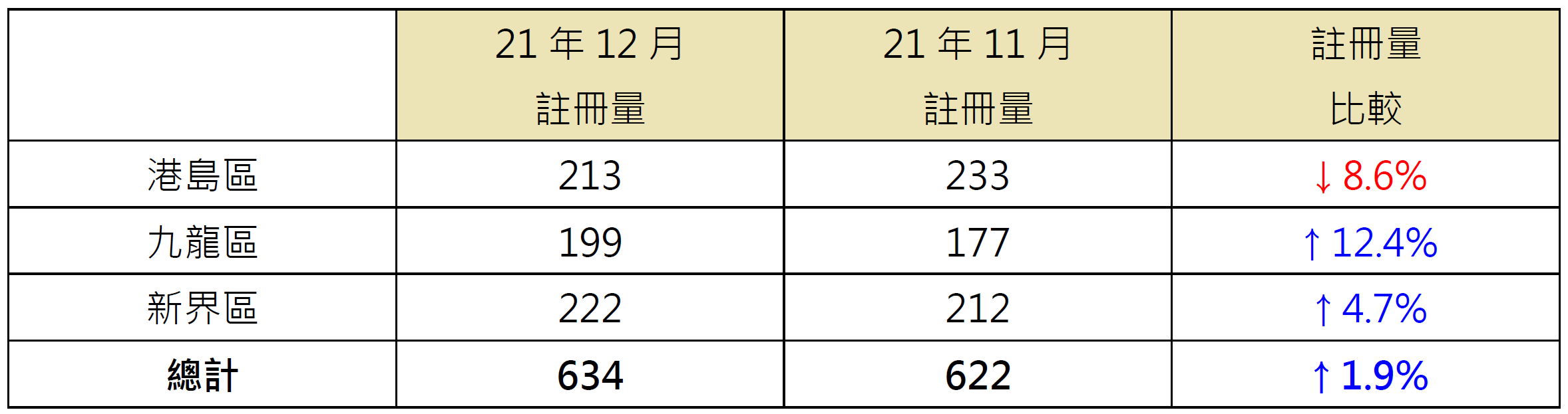 若以三区划分去年12月逾1,000万元二手住宅注册量表现,当中港岛区录213宗注册,较11月的233宗减少约8.6%;相反,新界区录222宗注册,较11月的212宗增加约4.7%;九龙区录199宗注册,较11月的177宗增加约12.4%(见表)。