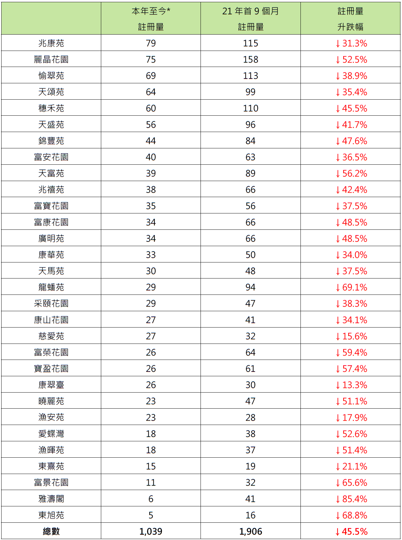 而本年至今二手居屋注册量屋苑排名方面,屯门兆康苑暂以79宗注册居榜首,较21年首9个月的115宗减少约31.3%;九龙湾丽晶花园暂以75宗注册排第二,较21年首9个月的158宗减少约52.5%;沙田愉翠苑暂以69宗注册排第三,较21年首9个月的113宗减少约38.9%(见表)。