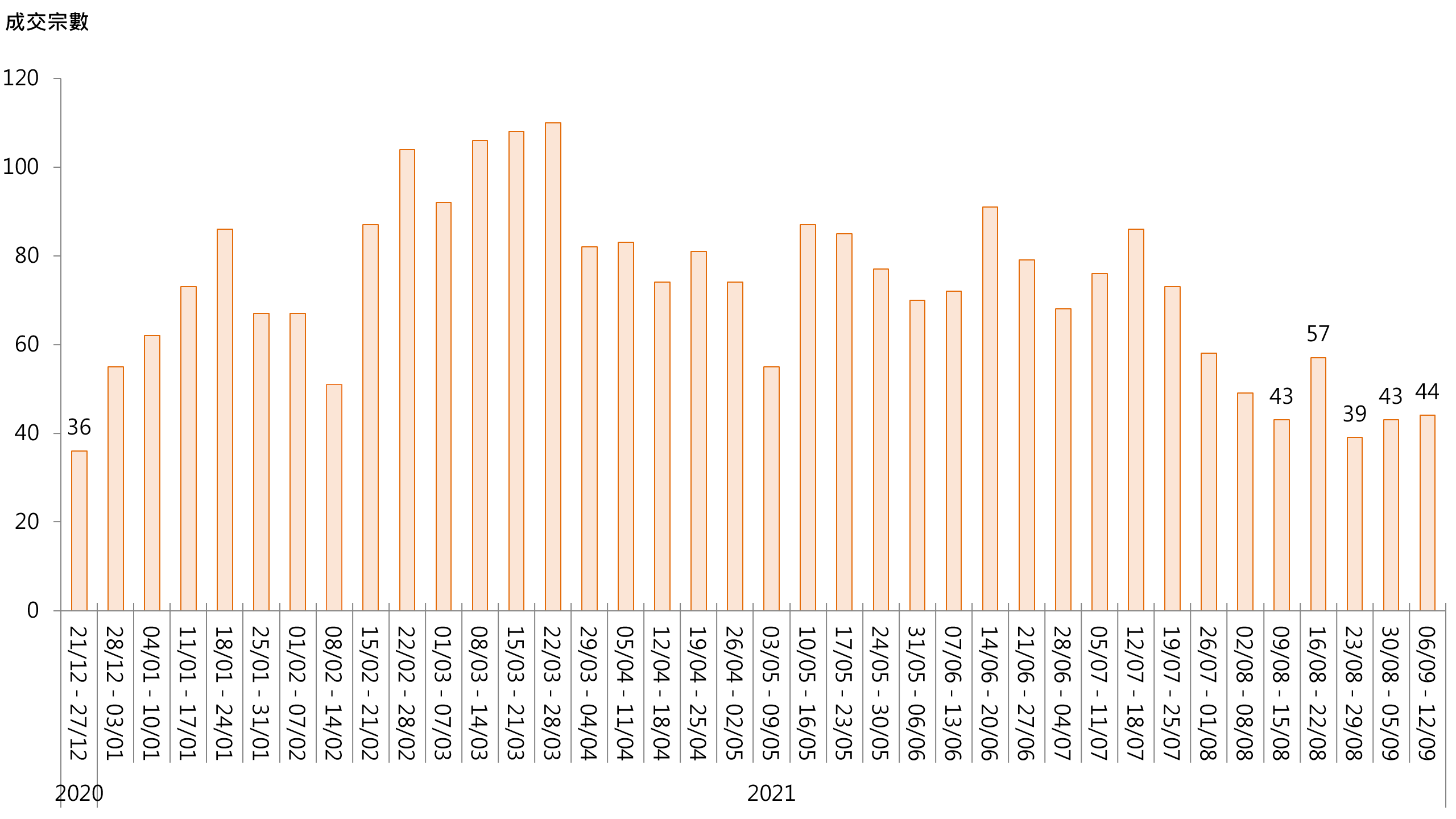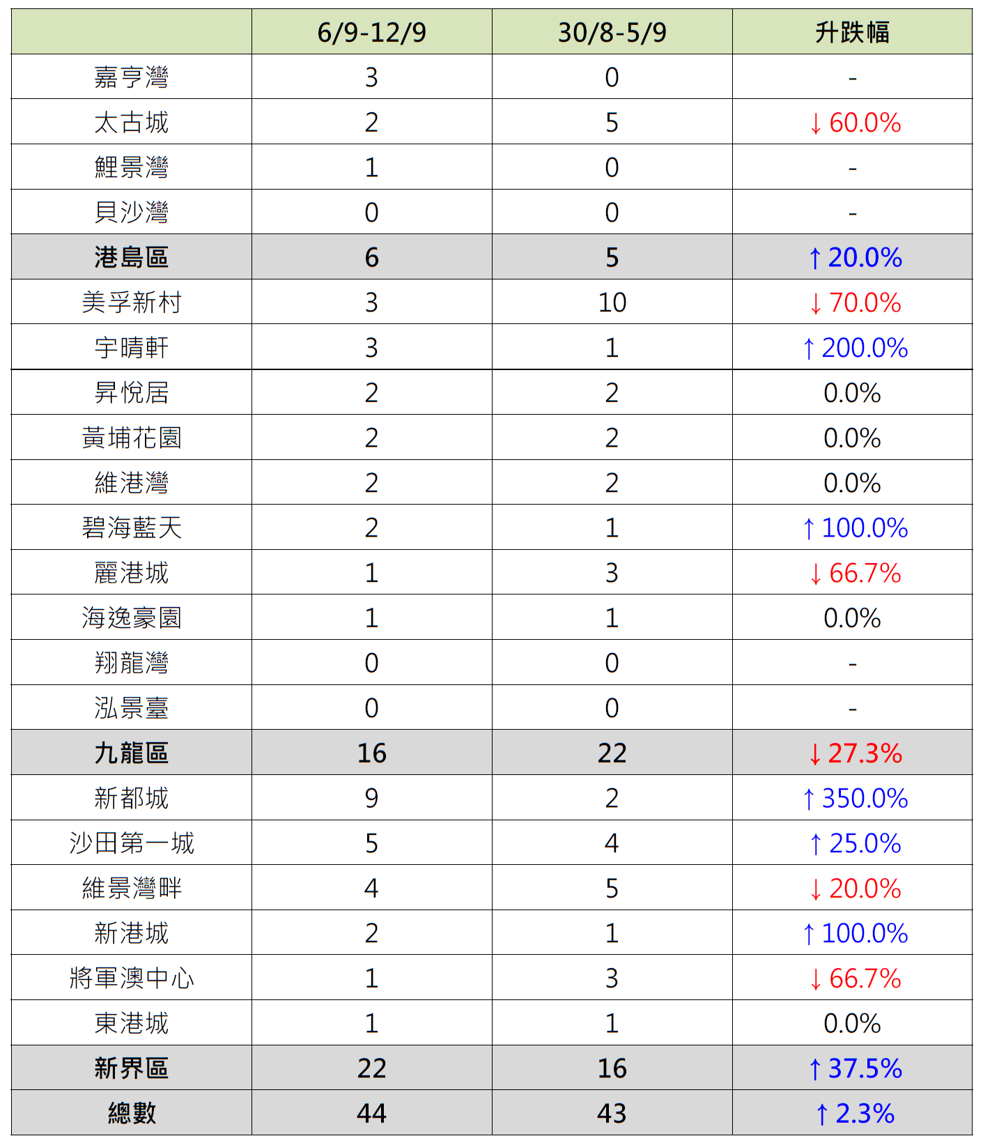 周末新盘销情理想,抢走部分二手购买力,二手成交持续疏落;据本行前线分行所录得的数字显示,综合过去一星期(9月6日至9月12日)全港20大主要屋苑二手买卖录44宗成交,与前周(8月30日至9月5日)的43宗相若,续于较低水平徘徊(见图)。