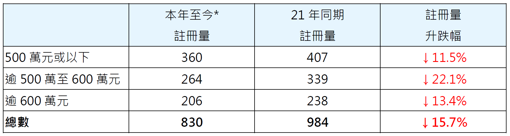 若按金额划分本年至今二手居屋注册量表现,其中价值逾500万至600万元二手居屋录264宗注册,较去年同期的339宗减少约22.1%;价值逾600万元二手居屋录206宗注册,较去年同期的238宗减少约13.4%;价值500万元或以下二手居屋录360宗注册,较去年同期的407宗减少约11.5%(见表一)。