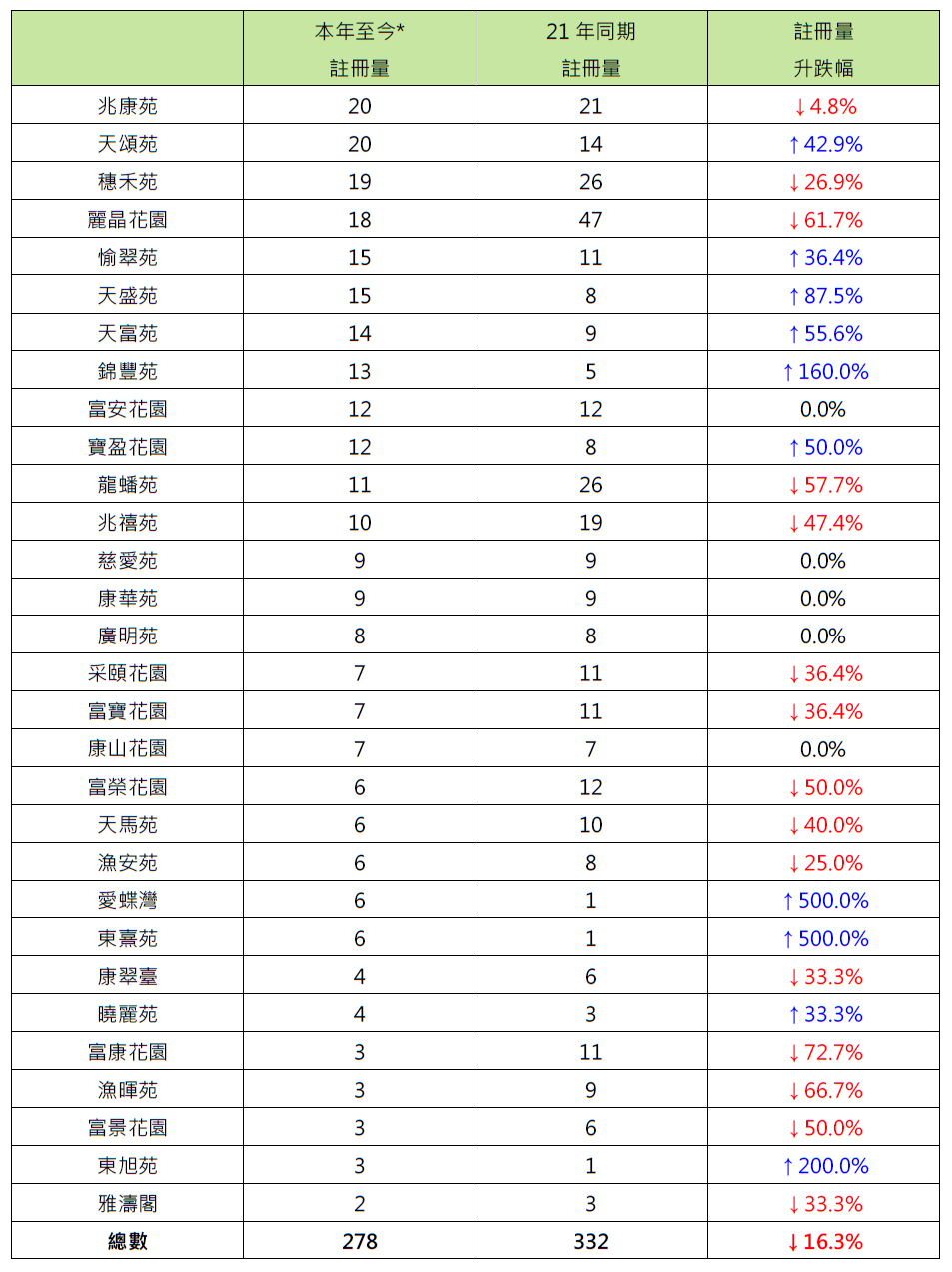 而本年至今二手居屋注册量屋苑排名方面,屯门兆康苑及天水围天颂苑各以20宗注册并列榜首,分别较去年同期的21宗及14宗减少约4.8%及增加约42.9%;火炭穗禾苑以19宗注册紧随其后,较去年同期的26宗减少约26.9%(见表二)。