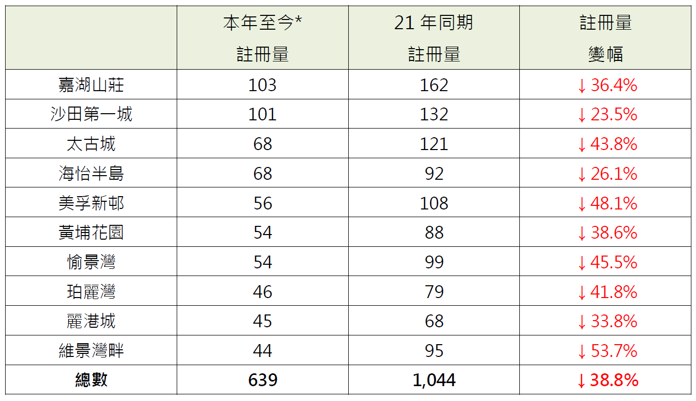 据土地注册处资料显示,本年至今(截至3月22日)二手住宅录7,988宗注册,较去年同期的12,818宗减少约37.7%;当中注册量最多的10个屋苑共录639宗注册,较去年同期的1,044宗减少约38.8%,与大市相若。