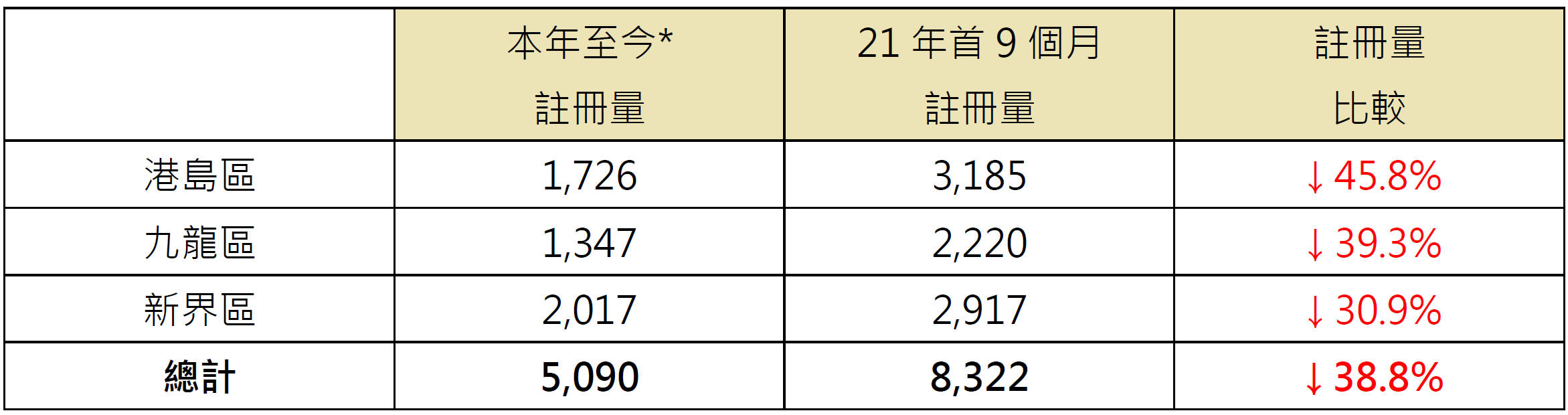 若以三区划分本年至今逾1,000万元二手住宅注册量表现,当中新界区录2,017宗注册,较21年首9个月的2,917宗减少约30.9%;九龙区录1,347宗注册,较21年首9个月的2,220宗减少约39.3%;港岛区录1,726宗注册,较21年首9个月的3,185宗减少约45.8%(见表)。