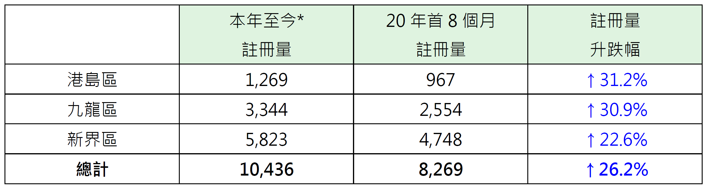 若以港岛、九龙及新界三区划分本年至今500万元或以下二手住宅物业注册量表现,其中港岛区录1,269宗注册,较去年首8个月的967宗增加约31.2%;九龙区录3,344宗注册,较去年首8个月的2,554宗增加约30.9%;新界区录5,823宗注册,较去年首8个月的4,748宗增加约22.6%(见表)。