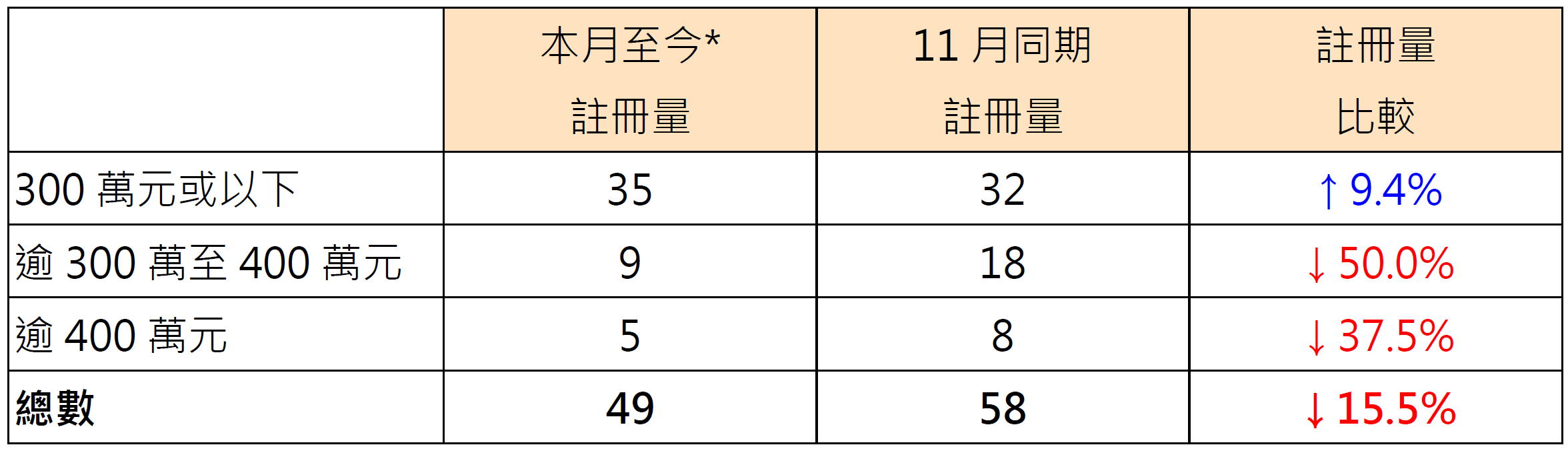表︰按金额划分本月至今*二手公屋注册量与11月同期比较