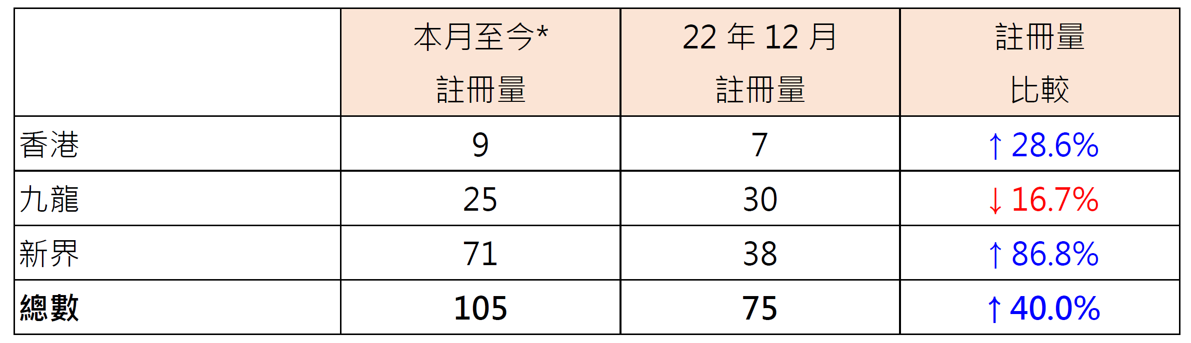 鉴于签署买卖合约至递交到土地注册处注册登记需时,每月注册个案一般主要反映前一个月市况