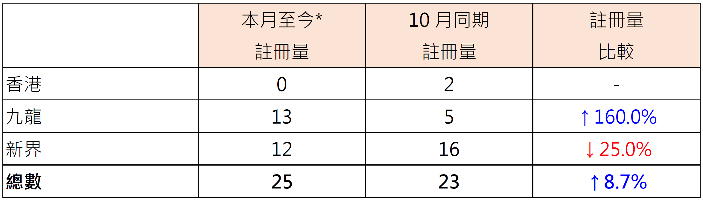 若按地区划分港岛、九龙及新界三区本月至今二手公屋注册量表现,其中九龙区录13宗注册,较10月同期的5宗增加1.6倍;相反,新界区录12宗注册,较10月同期的16宗减少25%;而港岛区暂未有注册个案(见表)。