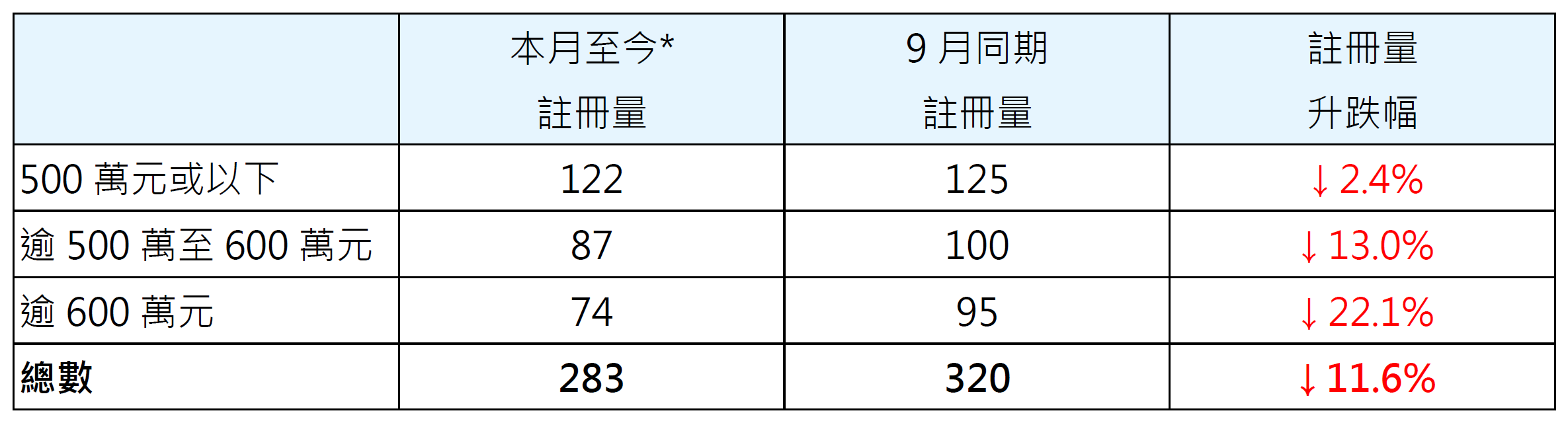 表一︰按金额划分本月至今*二手居屋注册量与9月同期比较