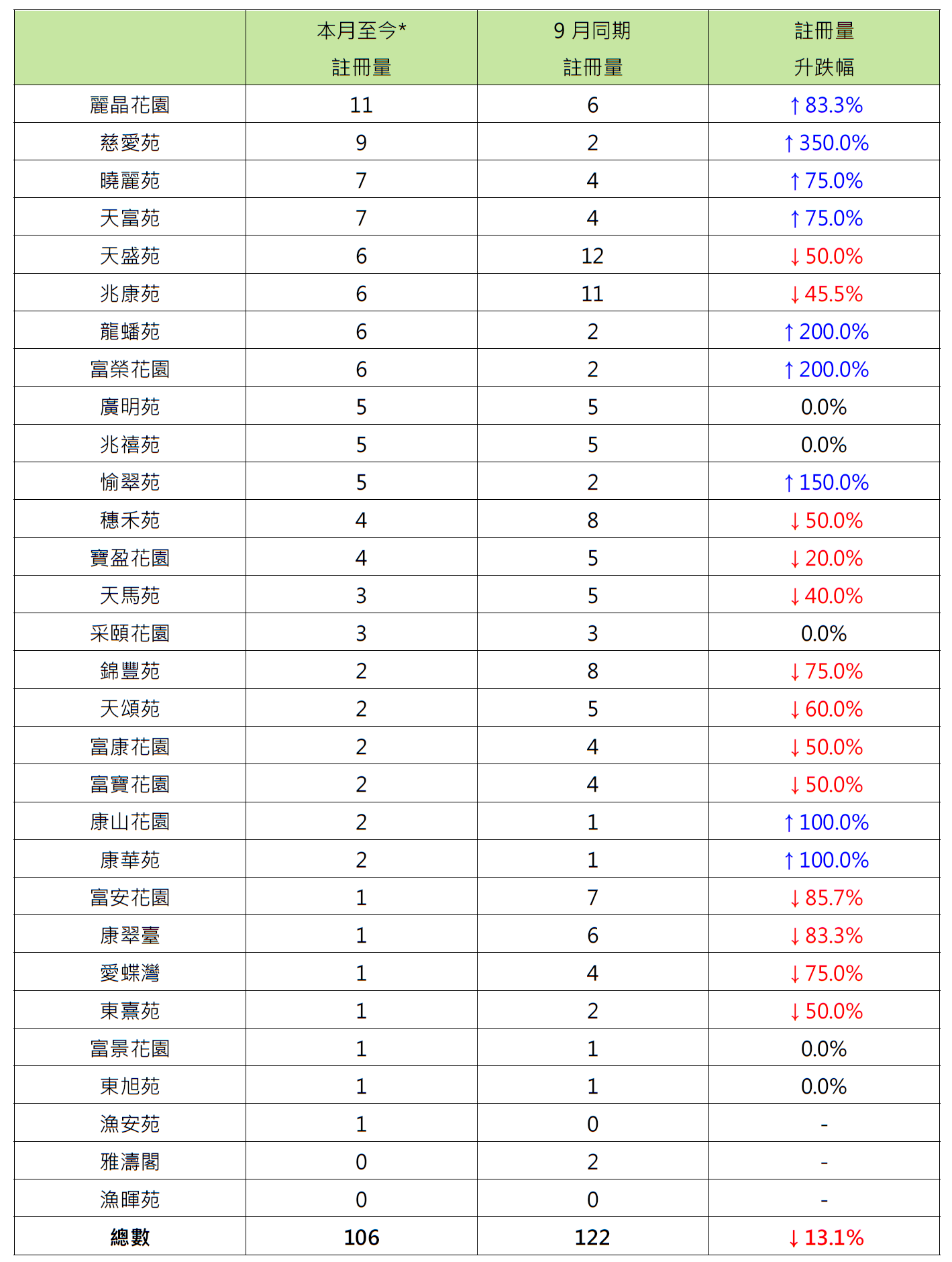 另外,本行选取的30个二手居屋屋苑本月至今录106宗注册,较9月同期的122宗减少约13.1%;当中有14个屋苑报跌,10个屋苑报升,6个屋苑持平;报跌屋苑中,马鞍山富安花园及柴湾康翠台各录得1宗注册,分别较9月同期的7宗及6宗减少约85.7%及约83.3%;马鞍山锦丰苑及筲箕湾爱蝶湾分别录得2宗及1宗注册,按月同期同样减少75%。
