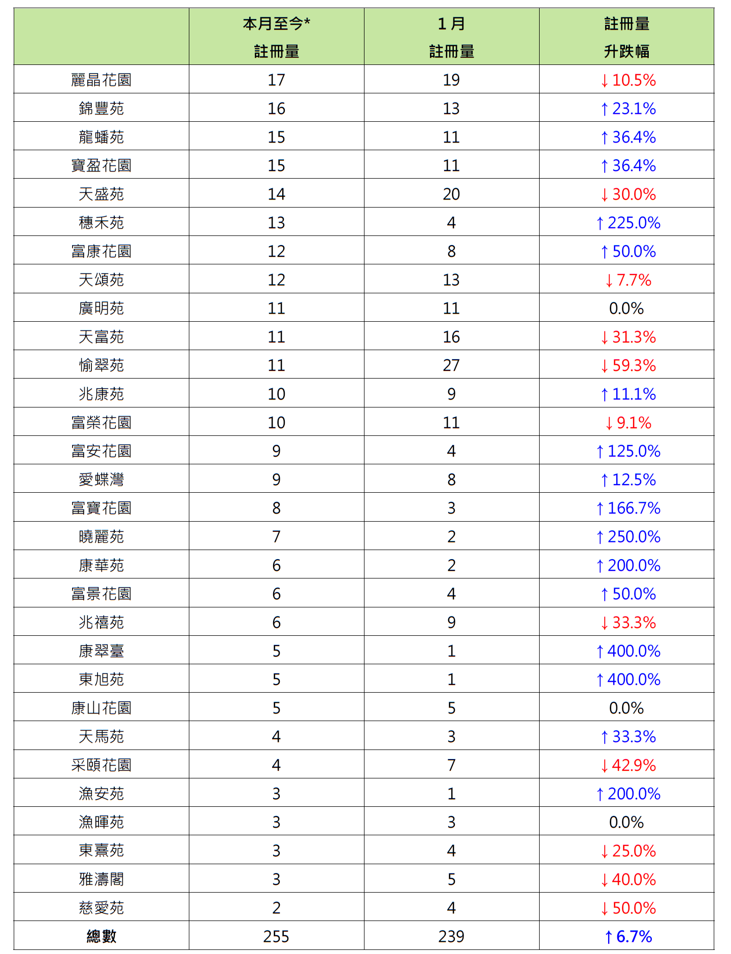 报升屋苑中,柴湾康翠台及筲箕湾东旭苑各录得5宗注册,同样较1月的1宗增加4倍;秀茂坪晓丽苑录7宗注册,较1月的2宗增加2.5倍。