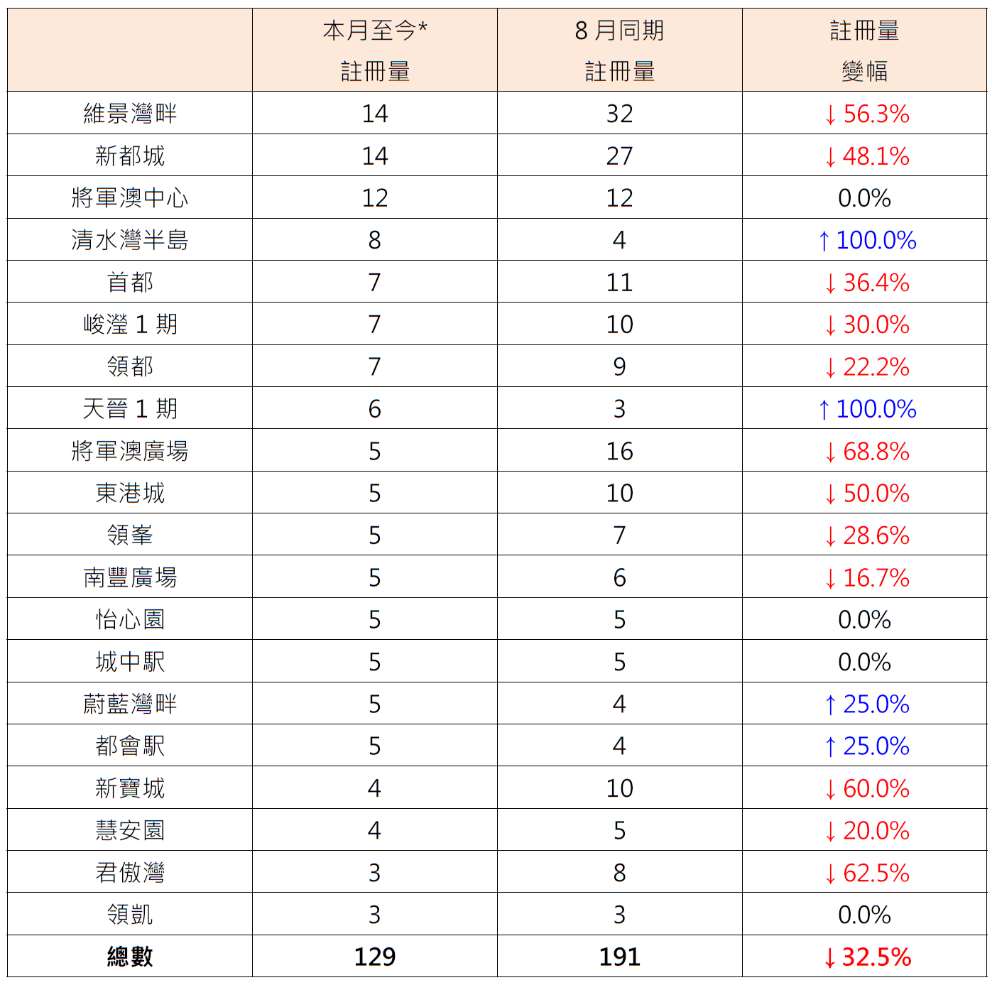 至于本月至今注册量屋苑排名方面,维景湾畔及新都城暂各以14宗注册并列榜首,分别较8月同期的32宗及27宗减少约56.3%及约48.1%;将军澳中心暂以12宗注册紧随其后,按月同期持平(见表)。
