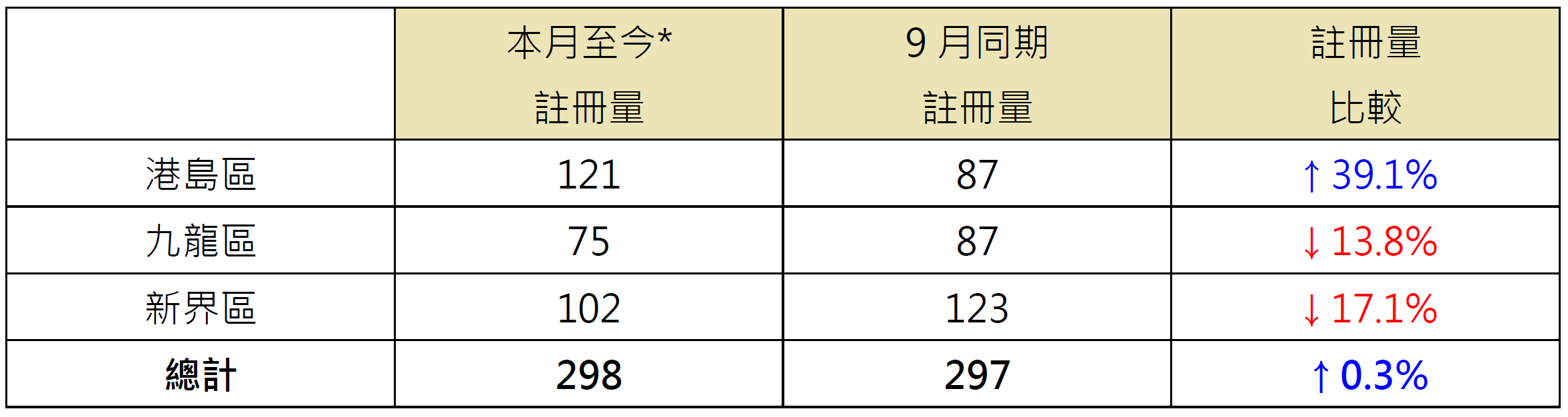 表:按三区划分本月至今*逾1,000万元二手住宅注册量与9月同期比较