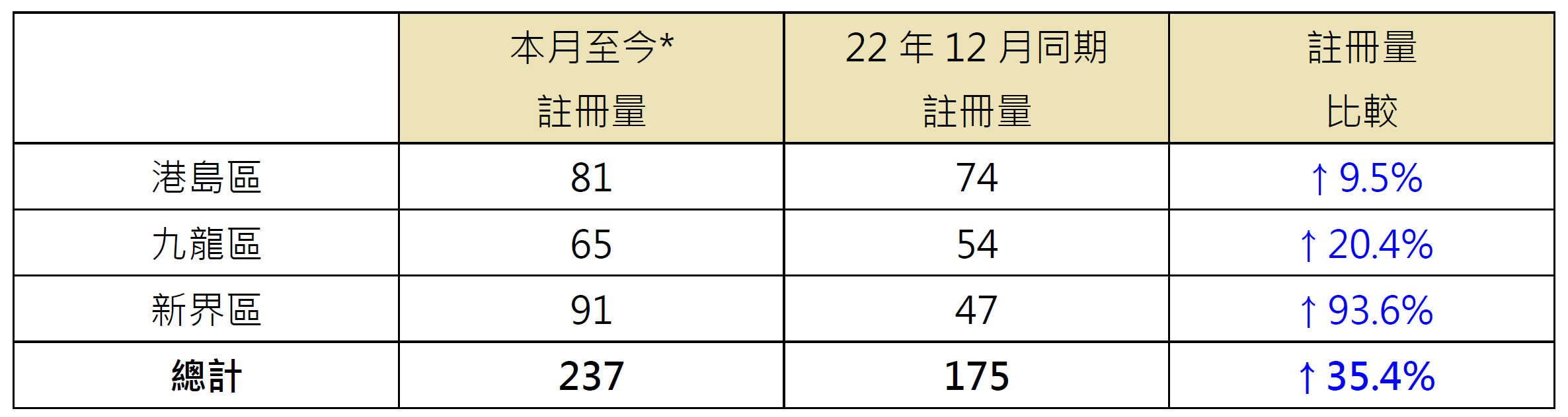 若以三区划分本月至今逾1,000万元二手住宅注册量表现,当中新界区录91宗注册,较12月同期的47宗增加约93.6%;九龙区录65宗注册,较12月同期的54宗增加约20.4%;港岛区录81宗注册,较12月同期的74宗增加约9.5%(见表)。