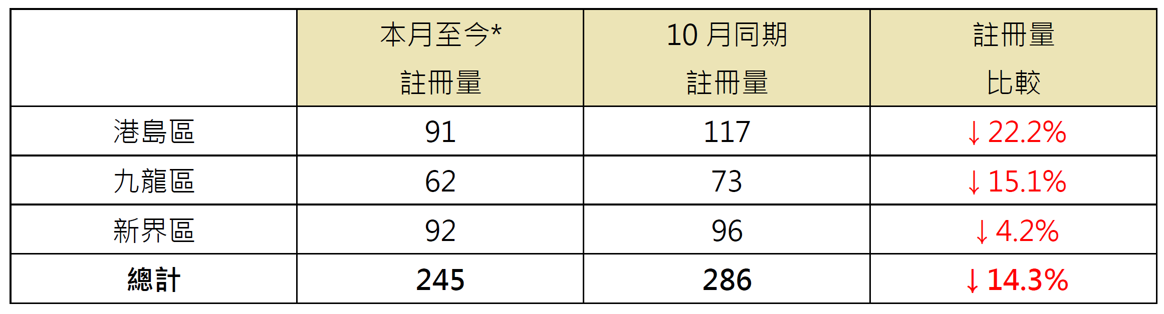 表:按三区划分本月至今*逾1,000万元二手住宅注册量与10月同期比较