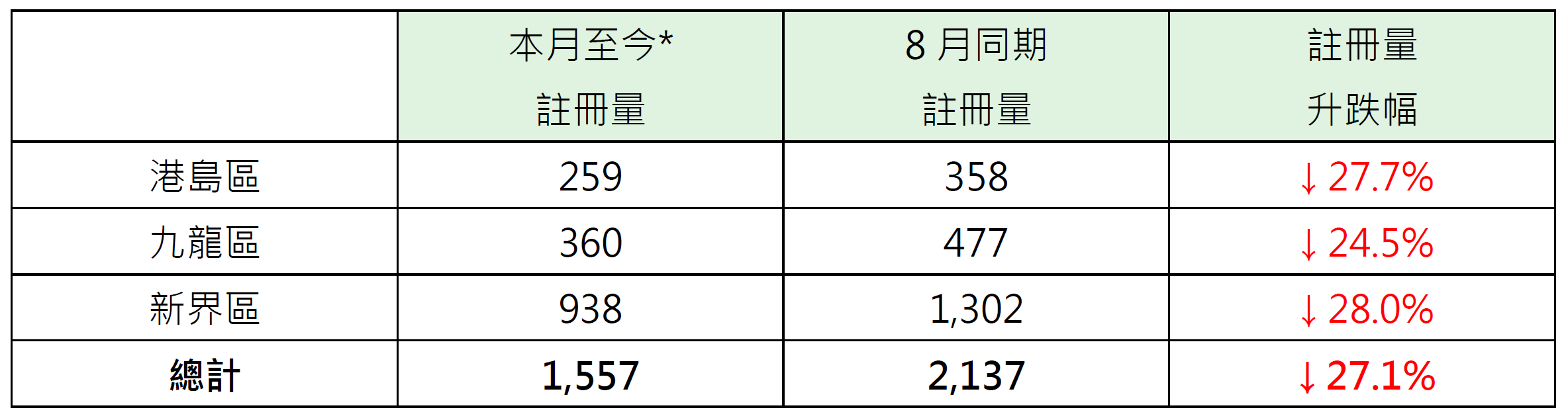 若以港岛、九龙及新界三区划分本月至今逾500万至1,000万元二手住宅注册量表现,其中九龙区录360宗注册,较8月同期的477宗减少约24.5%;港岛区录259宗注册,较8月同期的358宗减少约27.7%;新界区录938宗注册,较8月同期的1,302宗减少约28%(见表)。