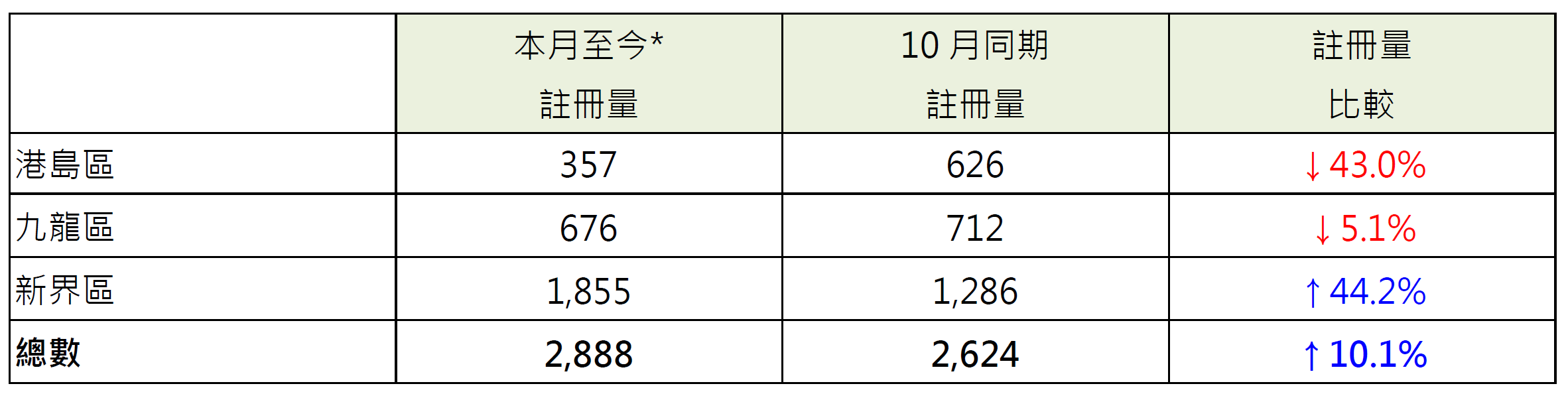 若以港岛、九龙及新界三区划分本月至今住宅物业注册量表现,当中新界区录1,855宗注册,较10月同期的1,286宗增加约44.2%;反观,九龙区录676宗注册,较10月同期的712宗减少约5.1%;港岛区录357宗注册,较10月同期的626宗减少约43%(见表)。
