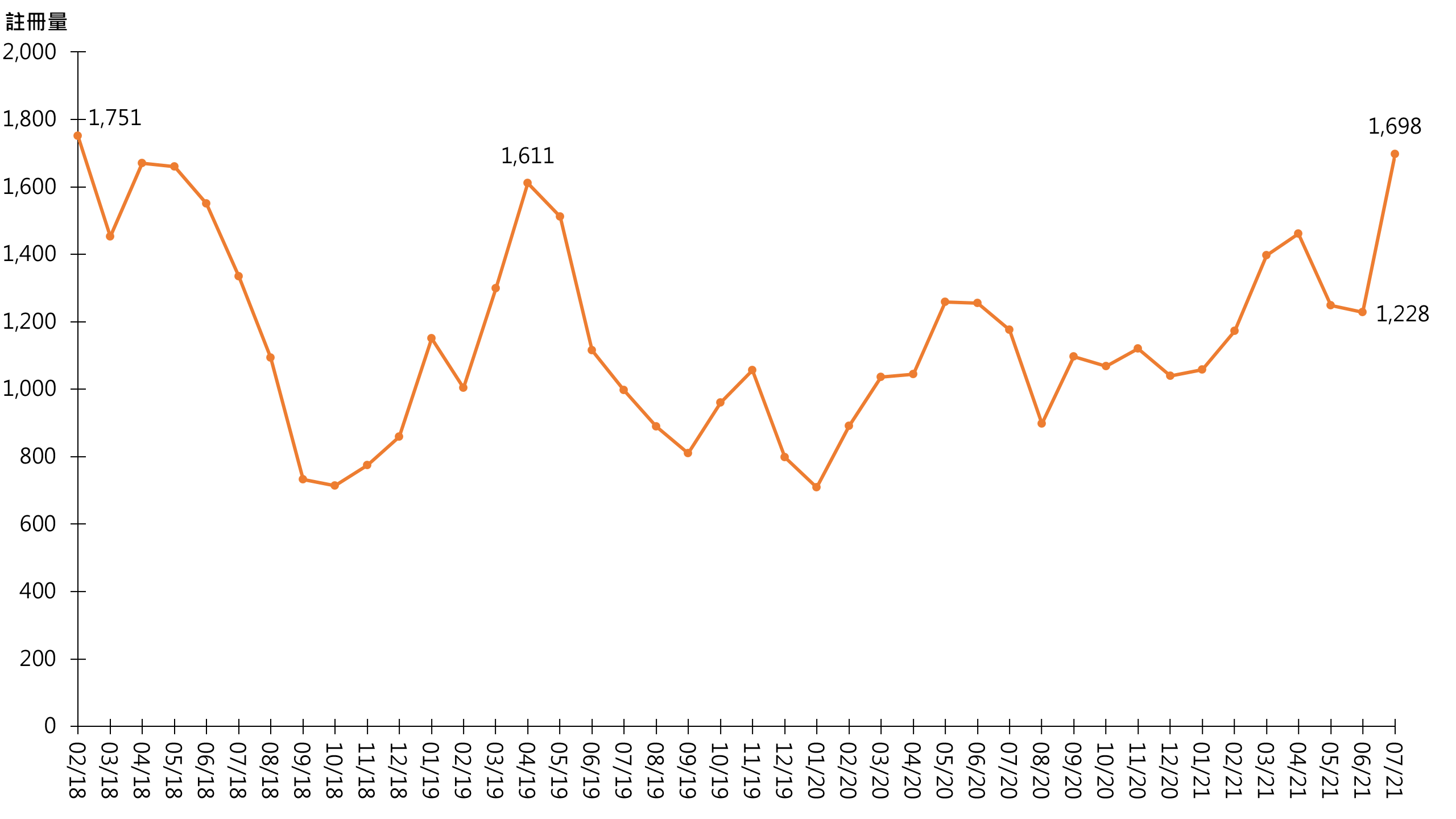 白居二入市,带动500万元或以下二手住宅物业注册量造好。据土地注册处最新资料显示,7月500万元或以下二手住宅物业录1,698宗注册,较6月的1,228宗增加约38.3%,创近41个月新高(见图)。鉴于签署买卖合约至递交到土地注册处注册登记需时,7月注册个案一般主要反映6月市况。
