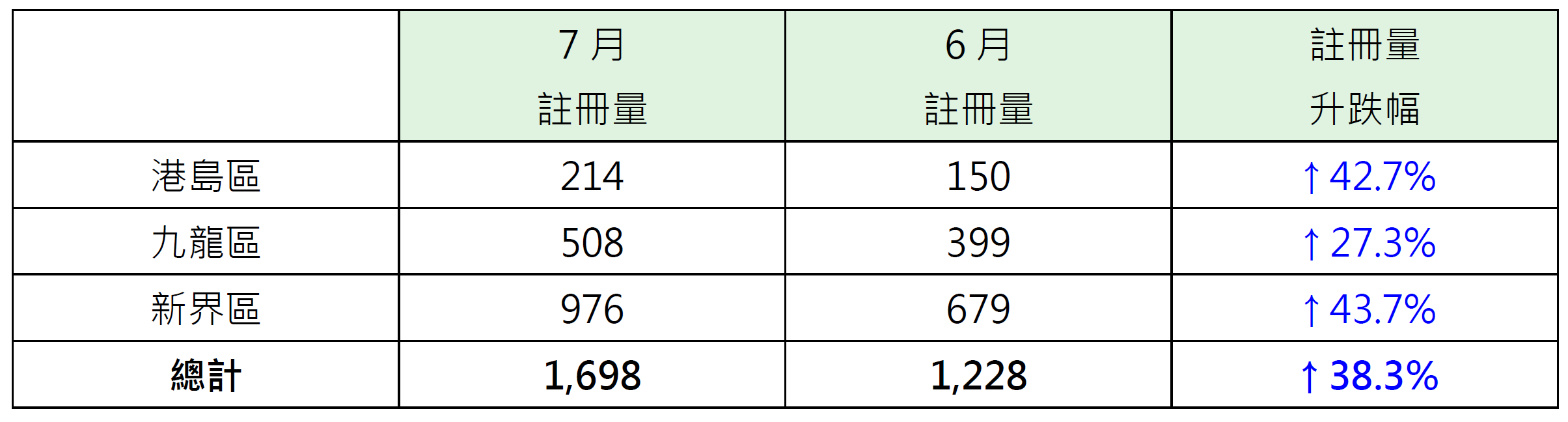 另外,若以港岛、九龙及新界三区划分7月500万元或以下二手住宅物业注册表现,其中新界区录976宗注册,较6月的679宗增加约43.7%;港岛区录214宗注册,较6月的150宗增加约42.7%;九龙区录508宗注册,较6月的399宗增加约27.3%(见表)。