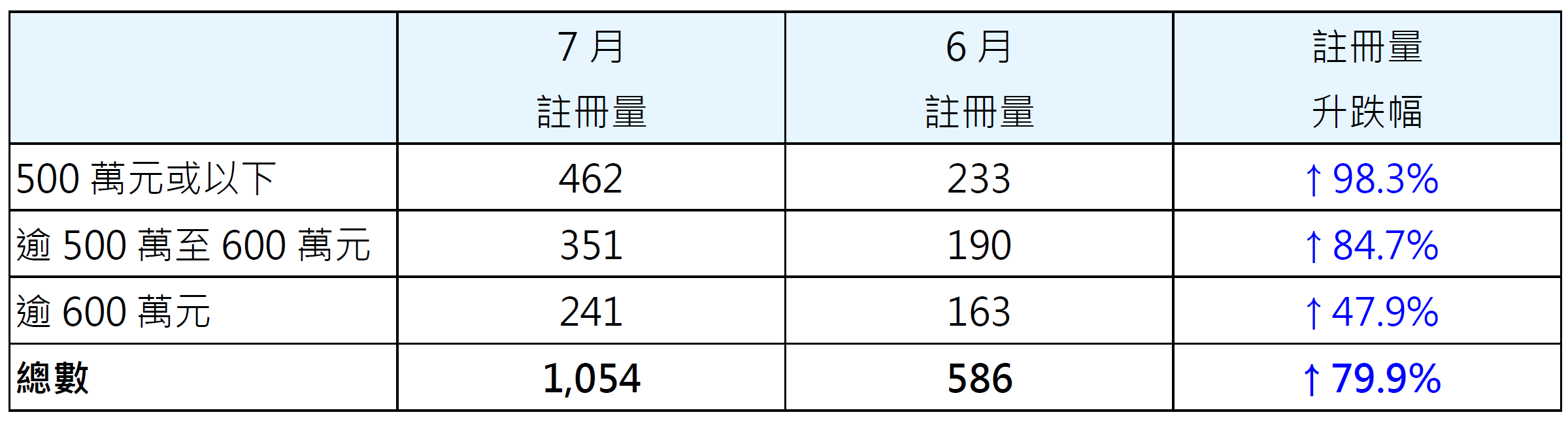 表一︰按金额划分7月二手居屋注册量与6月比较