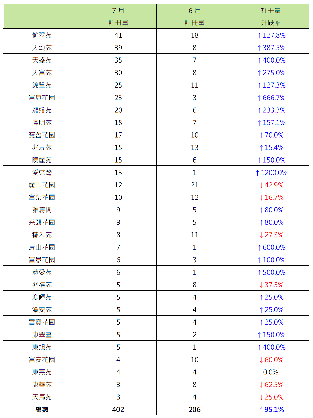 另外,本行选取的30个二手居屋屋苑7月录402宗注册,较6月的206宗大增约95.1%。当中有22个屋苑报升,7个屋苑报跌,1个屋苑持平。报升屋苑中,筲箕湾爱蝶湾录13宗注册,较6月的1宗大增12倍;将军澳富康花园录23宗注册,较6月的3宗大增约6.67倍;鲗鱼涌康山花园录7宗注册,较6月的1宗大增6倍。