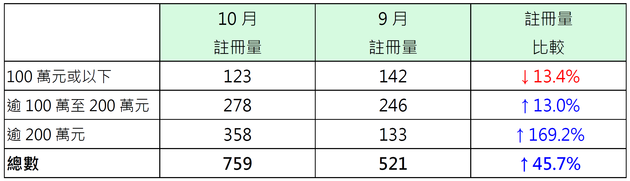 另外,若按金额划分10月纯车位注册量表现,其中价值200万元以上纯车位录358宗注册,较9月的133宗增加近1.7倍,表现最好;价值100万以上至200万元纯车位录278宗注册,较9月的246宗增加约13%;相反,价值100万元或以下纯车位录123宗注册,较9月的142宗减少约13.4%(见表)。