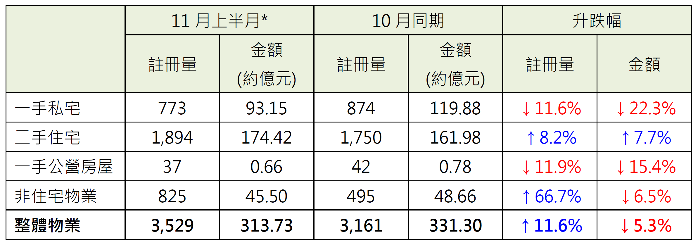 据土地注册处资料显示,11月上半月(截至15日)整体物业(包括一、二手住宅、一手公营房屋、工商舖及车位)录3,529宗注册,较10月同期的3,161宗增加约11.6%;涉及注册金额录约313.73亿元,较10月同期约331.30亿元则减少约5.3%。鉴于签署买卖合约至递交到土地注册处注册登记需时,11月注册个案一般主要反映10月市况。