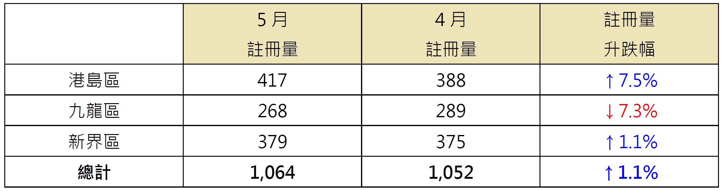 若以港岛、九龙及新界三区划分5月逾1,000万元二手住宅注册量表现,其中港岛区于三区中表现最好,录417宗注册,较4月的388宗增加约7.5%;新界区录379宗注册,较4月的375宗增加约1.1%;相反,九龙区录268宗注册,较4月的289宗减少约7.3%(见表)。