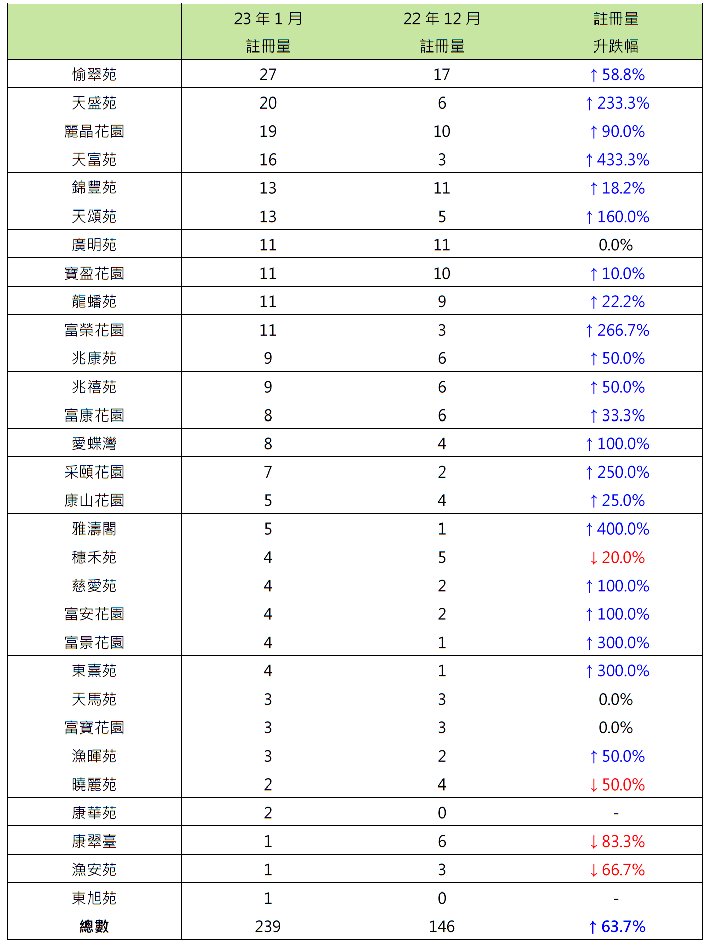 报升屋苑中,天水围天富苑录16宗注册,较去年12月的3宗增加逾4.3倍;黄竹坑雅涛阁录5宗注册,较去年12月的1宗增加4倍;小西湾富景花园及筲箕湾东熹苑各录得4宗注册,同样较去年12月的1宗增加3倍。