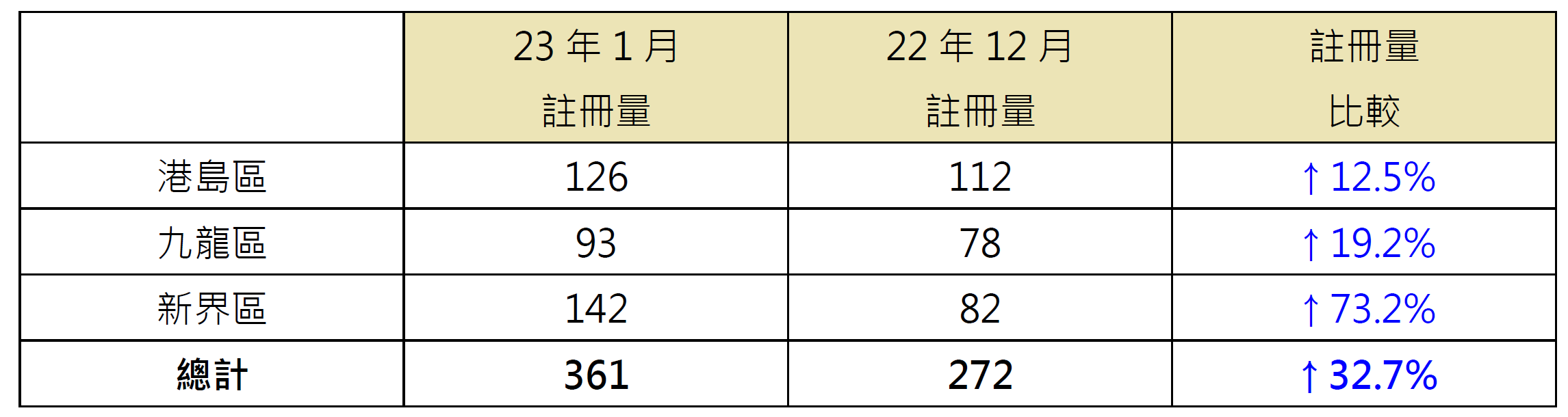 若以三区划分1月逾1,000万元二手住宅注册量表现,当中新界区录142宗注册,较去年12月的82宗增加约73.2%;九龙区录93宗注册,较去年12月的78宗增加约19.2%;港岛区录126宗注册,较去年12月的112宗增加12.5%(见表)。