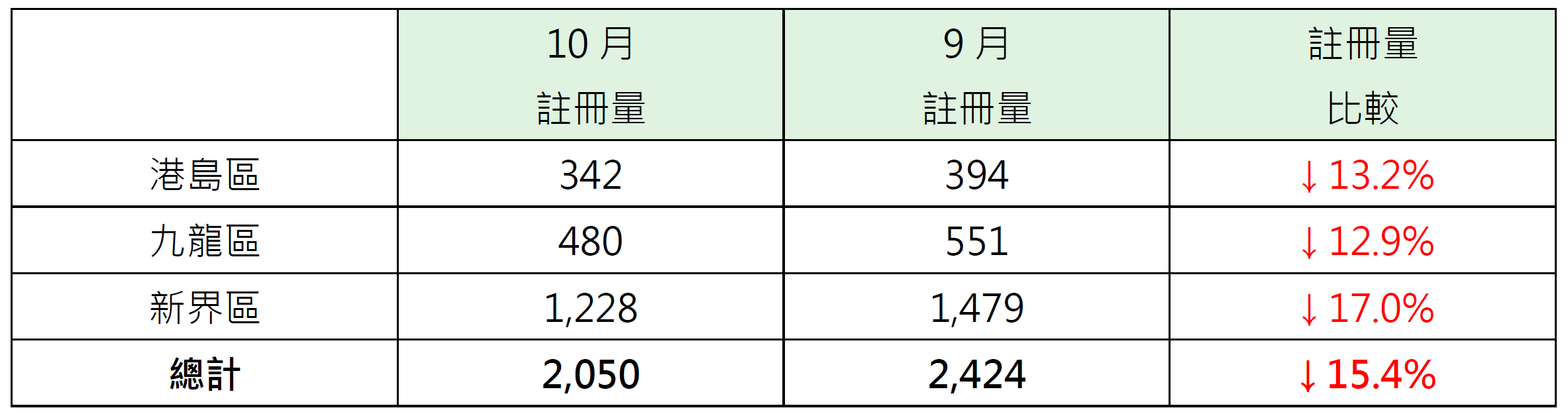 若以港岛、九龙及新界三区划分10月逾500万至1,000万元二手住宅注册量表现,其中九龙区录480宗注册,较9月的551宗减少约12.9%;港岛区录342宗注册,较9月的394宗减少约13.2%;新界区录1,228宗注册,较9月的1,479宗减少约17%(见表)。