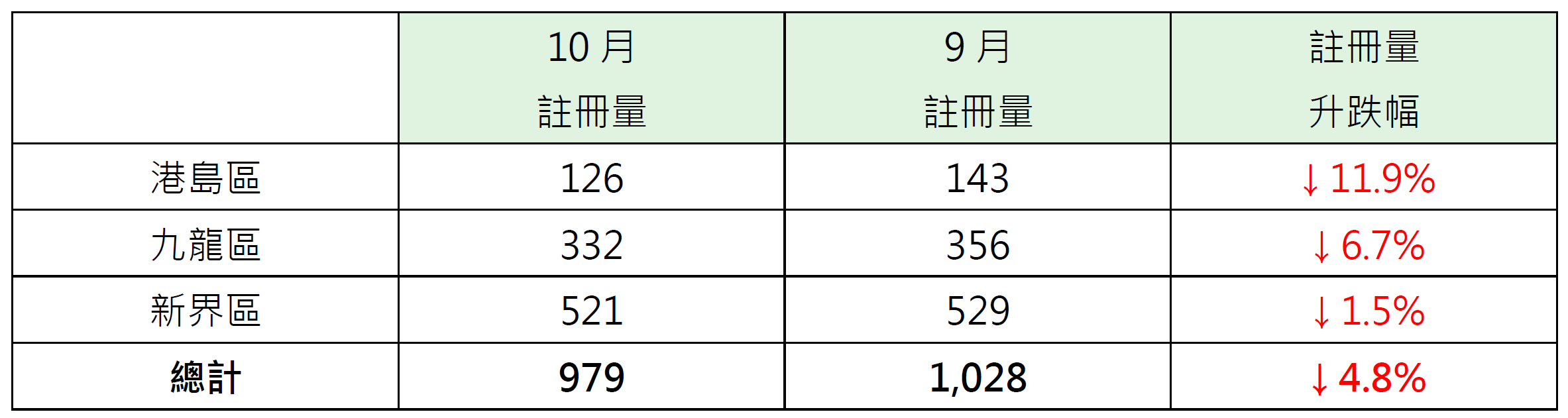 据土地注册处最新资料显示,10月500万元或以下二手住宅物业录979宗注册,较9月的1,028宗减少约4.8%,创近14个月新低(见图)。鉴于签署买卖合约至递交到土地注册处注册登记需时,10月注册个案一般主要反映9月市况。